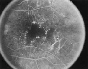After PRP, retinal circulation is definitely improved. There is a better regulatory response to hypoxia and decreased blood flow.143,144 The exact mechanism by which PRP works remains unknown. Some investigators believe that PRP decreases production of vasoproliferative factors first by eliminating some of the hypoxic retina or by stimulating the release of anthangiogenic factors from the retinal pigment epithelium.145 An alternative hypothesis is that vessel dilatation caused by chronic hypoxia is the direct stimulus for endothelial cell proliferation and neovascularization and that PRP works by thinning the retina. Vasodilatation is reduced by increased diffusion of oxygen from the choroid.146–149 Another possibility is that PRP decreases choroidal circulation in the midperiphery, which in turn shunts blood flow centrally, (“reverse choroidal steal”) decreasing the stimulus for NVD.150 Finally, others suggest that PRP leads to an increase in vasoinhibitors either by stimulating the retinal pigment epithelium to produce inhibitors of vasoproliferation145,151 or by causing a breakdown of the blood–retinal barrier so that serum vasoinhibitors can diffuse into the vitreous.152 The goal of PRP is to arrest or to cause regression of the proliferating new vessels. The currently recommended therapy is 1600 to 2000 burns, 500 μm in diameter delivered through a wide-field or three-mirrored lens.153 The burns should be intense enough to whiten the overlying retina. This usually requires a power of 200 to 600 mW and duration of 0.1 seconds. The usual PRP decreases the electroretinogram by 40% to 70%154,155 and destroys approximately 14% of the total retinal area.155 Most ophthalmologists use the argon blue–green or green laser, but a large clinical trial has shown that krypton red is equally effective.156 The number of burns necessary to achieve these goals has not been established. Some retinal specialists feel that there is no upper limit to the total number of burns and that treatment should be continued until regression occurs.157–160 However, it remains to be proven that the eye benefits from thousands of burns. In fact, the only prospective, controlled study found that eyes that received supplementary treatment had no difference in reduction in risk factors or better visual acuity than did eyes that received only a standard PRP.161 Once the DRS had proved that PRP was effective in preventing severe visual loss in patients with high-risk characteristics, the question arose as to whether treatment of mild PDR or severe NPDR would lower still further the risk of blindness from diabetic retinopathy. The ETDRS found that PRP significantly retards the development of high-risk characteristics in eyes with severe NPDR and macular edema.11 After 7 years of follow-up, 25% of eyes that received PRP developed high-risk characteristics compared to 75% of eyes in which PRP was deferred until high-risk characteristics developed. Nevertheless, the ETDRS concluded that treatment of PPDR and of PDR short of high-risk characteristics was not indicated. First, after 7 years of follow-up, 25% of eyes assigned to deferral of PRP never developed high-risk characteristics. Second, when patients are closely monitored and PRP is given as soon as high-risk characteristics develop severe visual loss can be prevented. After 7 years of follow-up, 4.0% of eyes that did not receive PRP until high-risk characteristics developed had a visual acuity of 5/200 or less compared to 2.5% of eyes assigned to immediate PRP. The difference was neither clinically nor statistically significant. So, if all eyes with severe NPDR received PRP, many would be treated unnecessarily. Third, PRP has significant complications. PRP often causes decreased visual acuity by increasing macular edema162–164 or by causing macular pucker. Fortunately, the edema frequently regresses spontaneously over 6 months. The visual field is usually moderately decreased.113 Color vision and dark adaptation, which are often already impaired, are also worsened by PRP.114–116 Finally, PDR is associated with an increased risk of myocardial infarction and increased mortality.165 Many patients will die before they develop complications of the PDR. Peripheral Retinal Cryotherapy Peripheral retinal cryotherapy (PRC) is used to treat eyes with high-risk characteristics and with media too hazy for PRP. Reported benefits include resorption of vitreous hemorrhages and regression of NVD, NVE, and NVI.166–172 The main complication is the development or acceleration of traction retinal detachment in 25% to 38% of eyes.170,173 Therefore, this treatment should be avoided in patients with known traction retinal detachment and all patients must be carefully monitored. An alternative treatment in eyes with hazy media is transscleral diode laser photocoagulation. Treatment of Macular Edema Patz and co-workers174 were the first to show that focal argon laser photocoagulation decreases or stabilizes macular edema. Later, the ETDRS confirmed their results. The ETDRS defined clinically significant macular edema (CSME) as (1) retinal thickening involving the center of the macula, (2) hard exudates within 400 μm of the center of the macula (if they are associated with retinal thickening), or (3) an area of macular edema greater than one disc area which is within one disc diameter of the center of the macula. The treatment strategy was to treat all leaking microaneurysms farther than 500 μm from the center of the macula (Fig. 23) and to place a grid of 100 to 200 μ burns in areas of diffuse capillary leakage and in areas of capillary nonperfusion. After 3 years of follow-up, 15% of eyes with eyes with CSME had doubling of the visual angle as opposed to 32% of nontreated control eyes.175 Recent subgroup analysis showed that treatment could be deferred in eyes in which the center of the fovea is not thickened as long as hard exudates are not threatening the center. Howeve