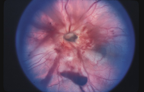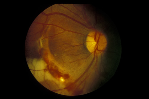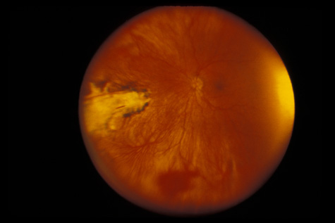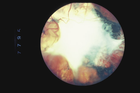 RETINITIS SCLOPETERIA Retinitis sclopeteria is the rupture of the choroid or retina caused by shock waves generated by passage of a high-velocity missile through the orbit without directly striking the eye. Initially a subretinal or vitreous hemorrhage is seen. If the optic nerve is damaged, visual acuity can be profoundly decreased. In severe cases, massive amounts of fibrous tissue proliferate into the eye (Fig. 27). In others, as the blood clears, a claw-like break is often seen in Bruch's membrane and in the choriocapillaris (Fig. 28). Retinal detachment rarely occurs at the site of the injury, probably because of binding of the retina to the choroid by fibrous tissue, but late detachment from a break at a distal site can occur.97,98