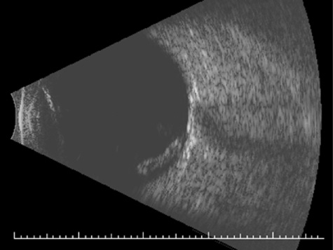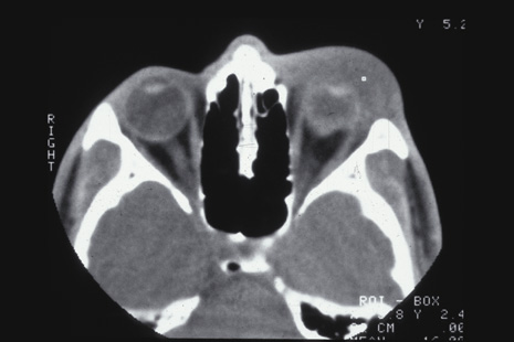 SCLERAL RUPTURE In eyes that have not undergone prior surgery, the two most common locations for scleral rupture are at the limbus (under intact conjunctiva) and parallel to the muscle insertions between the insertion and the equator. Radial and posterior ruptures are relatively uncommon.29 The hallmarks of scleral rupture are severe reduction in visual acuity, an afferent pupillary defect, hypotony (although a normal intraocular pressure does not rule out a small rupture), an abnormally deep anterior chamber, decreased ocular ductions, severe subconjunctival edema (Fig. 24), hyphema, and vitreous hemorrhage.92 The diagnosis can rarely be confirmed by ophthalmoscopy because severe vitreous hemorrhage, hyphema, or both nearly always accompany scleral rupture. Ultrasonography and computed tomography (CT) scanning may be helpful. Both show a shrunken globe. In addition, the CT scan shows subconjunctival edema (Fig. 25). In eyes in which the anterior chamber depth cannot be seen because hyphema, ultrasonography and CT scanning often show a deepened chamber. CT scanning is also useful in identifying any intraocular foreign bodies.