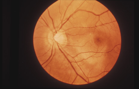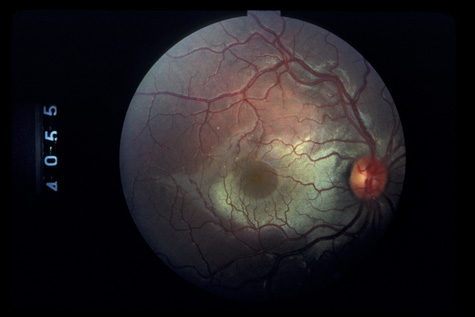 COMMOTIO RETINAE Commotio retinae (Latin, meaning retinal contusion) is a contrecoup injury. It can occur peripherally (Fig. 8) or centrally, in which case it is called Berlin's edema (Fig. 9). Immediately and for several hours after the trauma, the retina appears normal, although the patient may complain of decreased vision. Thereafter, the outer layers of affected retina become opaque. On fluorescein angiography, the opaque retina blocks background choroidal fluorescence, and in most cases there is no leakage into or under the retina (Fig. 10). For years, clinicians had difficulty explaining this blockage, because leakage is expected in conditions with edema. It was then shown in experimental animals and in human autopsy eyes that Berlin's edema is not true edema. The retinal opaqueness is the result of intracellular edema and fragmentation of the photoreceptor outer segments and intracellular edema of the underlying pigment epithelium. There is little or no intercellular fluid.66–69