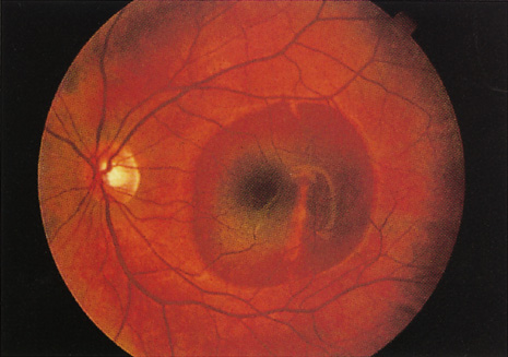 The visual acuity in commotio retinae varies from 20/20 to 20/400 and does not always correlate with the degree of retinal opacification. There is no known treatment. The prognosis is usually excellent except in cases with associated subfoveolar choroidal rupture and in cases with choroidal rupture with subfoveolar hemorrhage. Poor visual recovery can also be expected in cases with severe retinal pigment epithelial damage. Serous retinal detachment (Fig. 11) signals this condition, which can be confirmed by leakage of fluorescein into the subretinal space.70 The late manifestations of contrecoup injury to the retinal pigment epithelium (RPE) vary from minor atrophic changes that are seen as transmission defects on fluorescein angiography to massive hyperplasia and migration of the RPE. This later condition results in bone corpuscular and granular pigmentation that resembles retinitis pigmentosa (Fig. 12).71,72 The traumatic pigmentary changes may be confined to the posterior pole, to the periphery, or to certain quadrants, or they may be more widespread. When the trauma to the RPE destroys photoreceptor cells, localized visual field defects result. Arcuate field defects are not found because the overlying nerve fiber nearly always remains intact. MACULAR HOLES In rare cases the retinal contusion causes cystoid macular edema that may, in turn, progress to a macular hole (Fig. 13). A macular hole can also be caused by acute posterior vitreous detachment with foveal traction. In such cases, an overlying operculum is seen. Surgically, the macular hole can sometimes be closed with vitrectomy and gas injection.73 However, in some cases macular holes can spontaneously close, and because of this possibility some suggest observation for 4 to 6 months after the injury.74,75