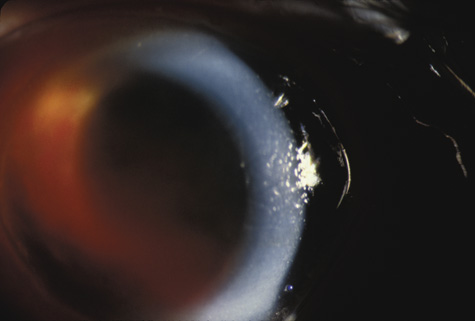 In injuries severe enough to cause a full-thickness corneal rupture, the wound usually crosses the limbus into the adjacent sclera. Exceptions are eyes that have had radial keratotomy, cataract surgery, or corneal transplantation, even years before the trauma.36–38 GLAUCOMA Acutely, the intraocular pressure may be normal, increased, or decreased. Aqueous outflow may be decreased because of angle recession, inflammatory trabeculitis, or hyphema. On the other hand, ciliary body injury tends to decrease aqueous inflow. The intraocular pressure depends on the balance of these factors. In patients who have large hyphemas, the pressure may rise abruptly. Therefore, it must be checked at regular intervals. It is especially important to monitor the intraocular pressure in hyphema patients who have sickle cell disease, be it homozygous or heterozygous. Unlike normal erythrocytes, sickled erythrocytes cannot pass through the trabecular meshwork and tend to occlude it, raising intraocular pressure. This, in turn, can cause central retinal artery obstruction even if the pressure is only in the high twenties or low thirties. Prompt paracentesis followed by surgical evacuation can restore vision.39 Late glaucoma can also develop, even years after the initial injury. Autopsy studies have found three ways by which the trabecular meshwork can be obstructed: proliferation of corneal endothelial cells and Descemet's membrane, proliferation of fibroblasts, and peripheral anterior synechiae (presumably from inflammation or from organization of blood in the angle for more than 7 days).40 Other possibilities are direct damage to the trabecular meshwork and damage to the ciliary muscle with reduced traction on the scleral spur. The risk is greatest in patients who have severe anterior segment damage such as cataract, angle recession, iris damage and displacement of the lens.41 Nine percent of patients with angle recession develop permanent glaucoma.42 If trabeculectomy is required, some authors recommend antimetabolites because the failure rate in patients with angle recession is greater than it is in patients with typical open angle glaucoma.43 LENS When the lens is struck by the cornea or by a strong shock wave, a transient anterior subcapsular cataract, known as a rosette cataract, may develop (Fig. 6). Repeated trauma, as in boxers, often causes posterior subcapsular cataract. Blunt trauma can also result in rupture of the anterior or posterior capsule.44,45 In severe cases, iridodonesis or a bead of vitreous in the anterior chamber signals a subluxed lens. Dislocation may also occur (Fig. 7). It is important to remember that ocular trauma is common, but lens dislocation is rare. Therefore, in patients with a dislocated lens, the clinician should always rule out predisposing causes such as Marfan's syndrome, homocystinuria and syphilis. In rare cases the lens itself can rupture and cause phacolytic glaucoma.