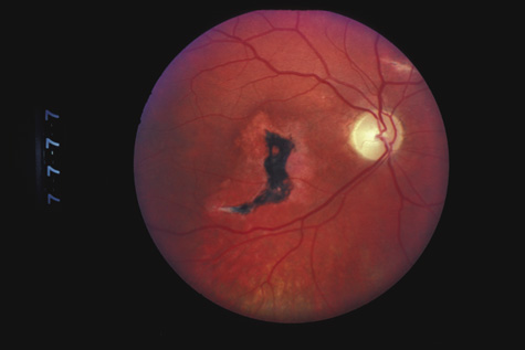 If the choroidal rupture is under the foveola or if an associated subretinal hemorrhage extends under the foveola, the visual prognosis is generally poor (Fig. 22); however, a recent study showed that even patients with foveal or multiple choroidal ruptures can regain good central vision after extended follow-up.86 If the rupture is elsewhere the prognosis is good because the overlying nerve fiber layer is almost never torn. Therefore, a rupture can be located between the disc and the macula and yet not affect the visual acuity (Fig. 21).