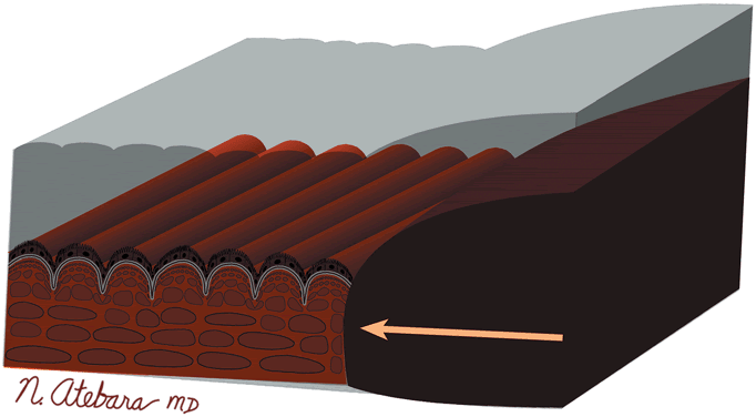 The mechanism by which chorioretinal folds are produced probably relates to mechanical forces that compress the “spongy” choroid, thereby throwing the relatively inelastic Bruch's membrane into folds. Choroidal tumors (choroidal melanomas, metastatic choroidal carcinomas) may produce chorioretinal folds at the margins of the tumor.13,15 These folds are produced by mechanical displacement of the surrounding choroid by the expanding tumor in conjunction with choroidal vascular engorgement. As the choroid is compressed laterally, the relatively inelastic Bruch's membrane is thrown into folds (Fig. 4). These folds roughly follow the shape of the tumor's margin. Optic disc swelling (papillitis, papilledema) may cause chorioretinal folds in a similar fashion, where expansion of the optic nerve at its entrance into the eye causes compression of the surrounding choroid (Fig. 5).4 The folds are sometimes seen concentric to the optic nerve in the meridians of greatest nerve swelling, often nasally. Orbital tumors may produce chorioretinal folds through scleral deformation and choroidal congestion. Interestingly, scleral indentation alone does not produce chorioretinal folds—it therefore appears that scleral edema, scleral shortening, choroidal congestion, and possibly other factors are necessary for the formation of chorioretinal folds. Scleral buckles placed for the repair of retinal detachment can cause chorioretinal folds. These folds are seen perpendicular to the buckle, and they may be exacerbated by the presence of a serous choroidal detachment (Fig. 6). Intraocular hypotony results from a wound leak or excessive filtration after glaucoma surgery. Chorioretinal folds may be seen in this condition. The folds may tend to radiate outward from the optic disc, may be concentric with the optic disc, or they may be randomly oriented. These folds may result from a combination of scleral contraction due to the low intraocular pressure, scleral edema, choroidal congestion, and optic disc swelling (Fig. 7).