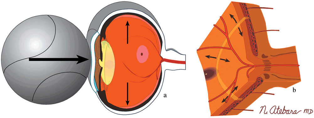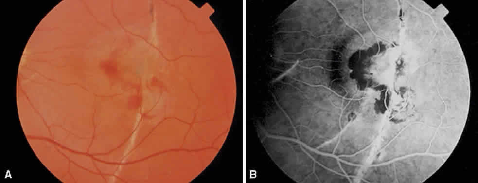 of the globe. Choroidal ruptures can occur from any trauma that results in rapid anterioposterior compression of the globe. It has been reported in various settings, including bungee elastic cords,81 paint ball injuries,82,83 and forceps birth delivery.84 Choroidal ruptures appear as yellow curved lines concentric to the optic nerve, located deep to the retina. They are most common in the posterior pole and midperipheral fundus85 (Fig. 18A). On fluorescein angiography, the ruptures appears as curvilinear window defects. There may be mild staining of the sclera, but there is no leakage unless choroidal neovascularization is also present (see Fig. 18B). Histologically, they represent disruption and retraction of the RPE, Bruch's membrane, and choroid, similar to that seen in angioid streaks. Healing of choroidal ruptures involves fibrovascular proliferation from the choroid that evolves into a dense fibrous scar with variable degrees of RPE hyperplasia, usually complete by 3 weeks.86 When the macula is involved, severe visual loss may result. Similar to angioid streaks and myopic lacquer cracks, choroidal neovascularization may occur, usually weeks to months following the initial injury. When the rupture is close to the center of the fovea (e.g., closer than 600 μm) and the length of the rupture is large (e.g., 4.5 mm or longer), closer monitoring of the eye is warranted because the risk for developing CNV is significantly higher risk.87 The pathologic mechanism of choroidal rupture formation is explained by the rapid anteroposterior compress of the globe during blunt trauma (Fig. 19A). The choroid is anchored to the sclera at the equator by the vortex veins. As the equatorial diameter of the sclera is rapidly increased by the ocular distortion, the choroid, Bruch's membrane, and RPE become stretched so rapidly that a break forms in these layers in a direction perpendicular to the line of stretch (which extends radially from the optic nerve to the equator of the globe). As a result, the choroidal rupture occurs concentric to the optic nerve (see Fig. 19B). There is no treatment for choroidal ruptures uncomplicated by submacular hemorrhage or choroidal neovascularization. There have been occasional reports in the literature of successful surgical evacuation of submacular hemorrhage with restoration of good central vision by means of vitrectomy and subretinal injection of tissue plasminogen activator.88,89 Successful surgical removal of three cases of subfoveal choroidal neovascularization with resulting visual acuities of 20/30 or better in each case has been reported90 (Fig. 20).