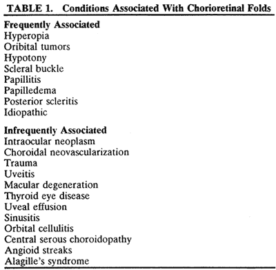 reflect tractional forces acting on the retina.10 OPHTHALMOSCOPY Chorioretinal folds are seen as alternating light and dark striae in the posterior pole, giving the fundus a corrugated appearance (Fig. 2).11 The darker striae correspond to the troughs of the folds where the RPE is viewed “on edge.” The lighter-colored striae correspond with the ridges, where the RPE layer is stretched thin. The width, length, and number of folds are variable. The folds are usually roughly parallel, except in hypotony (in which case the folds are often multidirectional), in a contracted choroidal neovascular membrane (in which case they may be radial), and in optic disc swelling (in which case they may be concentric). Careful biomicroscopic evaluation is helpful in establishing the level of the abnormality in the fundus. The overlying retina is usually uninvolved in isolated chorioretinal folds, although parallel retinal folds can occasionally occur.12 Chorioretinal folds should be distinguished from retinal folds, which are usually thinner, translucent, and radiating from a point of a visible pathologic process in the retina. Retinal folds are more superficial than chorioretinal folds. On careful biomicroscopic examination, the underlying choroid can be seen to be uninvolved in isolated cases of retinal folds. Retinal folds usually reflect tractional forces acting on the neurosensory retina, typically at its surface—the internal limiting membrane. The most common causes of retinal folds are idiopathic epiretinal membranes, diabetic fibrovascular membranes, and proliferative vitreoretinopathy associated with retinal detachment. FLUORESCEIN ANGIOGRAPHY Norton described the angiographic appearance of chorioretinal folds in 1969.13 In the arterial or early laminar venous phase of the angiogram, alternating lines of hyperfluorescence and hypofluorescence become apparent (Fig. 3). These fade in the late recirculation phase of the angiogram without leakage. The hyperfluorescent streaks correspond to the peaks of the chorioretinal folds, and the hypofluorescent streaks correspond to the valleys. Histopathologic evidence suggests that attenuation of the RPE at the peaks results in hyperfluorescence; compaction of the RPE layer in the valleys and partial collapse of the underlying choriocapillaris results in relative hypofluorescence.14 Because the RPE and choroidal are unaffected by retinal folds, the fluorescein angiographic appearance is usually normal, except for distortion of the retinal vessels or mild leakage, which may occur with epiretinal membranes. ETIOLOGY The differential diagnosis of chorioretinal folds is extensive (Table 1). The more common causes include orbital tumors, hypotony, papilledema or papillitis, posterior scleritis, hyperopia, and previous scleral surgery. Uncommon causes include intraocular tumor, choroidal neovascularization, trauma, uveitis, thyroid eye disease, uveal effusion, sinusitis, orbital cellulitis, central serous choroidopathy, angioid streaks, and Alagille's syndrome.3–9 Idiopathic chorioretinal folds are sometimes encountered as an incidental finding in an otherwise normal eye.