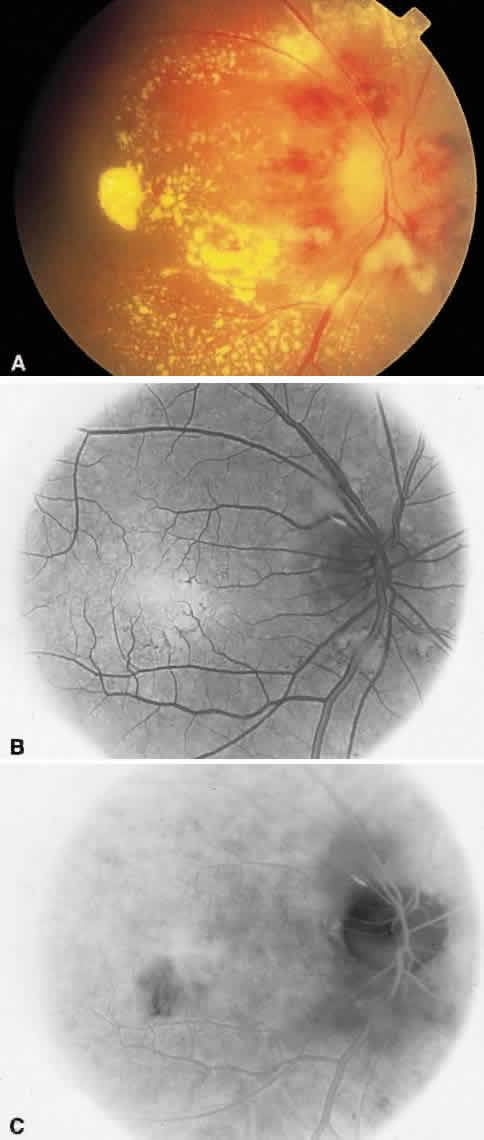 pancytopenia, not direct injury to the retina. The first ophthalmoscopic features of radiation retinopathy reflect vascular endothelial damage. Guyer and coworkers13 found that the earliest and most common finding was macular edema, present in 87% of patients within 3 years of radiation. Leakage of fluid and proteins into the neurosensory retinal tissue causes retinal edema and hard exudates. Structural decompensation of the vessel wall leads to intraretinal microaneurysms and intraretinal microvascular abnormalities. Hemorrhage of these microaneurysms result in dot and blot intraretinal hemorrhages.2–4,15–17 This funduscopic appearance is similar to that of diabetic retinopathy except that fewer microaneurysms usually are seen. Recognizing the similarity in disease progression patterns with background diabetic retinopathy, this early stage of the disease has been called “background radiation retinopathy.”18 The fundus photographs and fluorescein angiograms shown in Figures 3 and 4 demonstrate the findings seen in background radiation retinopathy. Figure 5 also reviews these findings. The later ophthalmoscopic features of radiation retinopathy are reflective of vascular occlusion at various layers of the retina and choroid. These changes may be considered “preproliferative radiation retinopathy.” Capillary endothelial damage from ionizing radiation results on patches of capillary nonperfusion. Ischemia in the nerve fiber layer, perfused by the peripapillary capillary retinal network, results in retinal cotton-wool spots. Alterations in retinal vascular blood flow result in retinal venous beading. Less commonly, occlusion of the larger retinal vessels occur. Retinal arterial and vein occlusions can be seen, possibly related to the vessel wall sclerosis seen histologically. Uncommonly, occlusion of the choroidal circulation can be seen, detected on fluorescein angiography or seen later as retinal pigment epithelial alterations. The fundus photographs and fluorescein angiograms shown in Figure 6 demonstrate the findings seen in preproliferative radiation retinopathy. Recently, it has been suggested that the term nonproliferative radiation retinopathy be used rather than distinguishing “background” from “preproliferative” radiation retinopathies. Proliferative radiation retinopathy occurs when retinal ischemia leads to neovascularization of the retina or optic disc, often adjacent to areas of capillary nonperfusion. The neovascularization can hemorrhage into the vitreous cavity or into the subhyaloid space, causing significant loss of vision. Guyer and associates13 found that the incidence of retinal neovascularization was relatively rare after proton beam radiation, occurring in only 6% of patients. Neovascularization of the iris also can occur, leading to hyphema or neovascular glaucoma. The ophthalmologic features of proliferative radiation retinopathy are illustrated in Figures 7 and 8. The incidence of fundus features of radiation retinopathy is listed in Table 1.