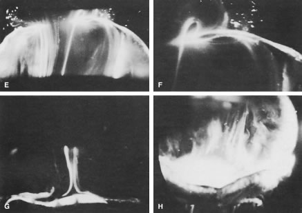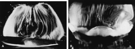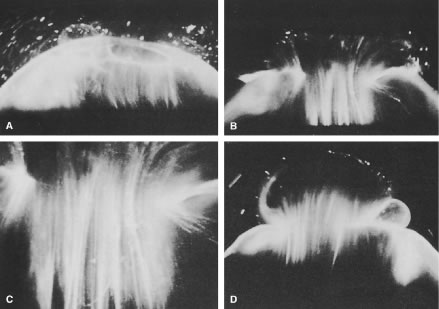 HISTORICAL PERSPECTIVE Duke-Elder78 claimed that the first theories of vitreous structure proposed that the vitreous is composed of “loose and delicate filaments surrounded by fluid,” as conceptualized in 1741 by Demours79 who formulated the alveolar theory. In 1780, Zinn80 proposed that the vitreous is arranged in a concentric, lamellar configuration similar to the layers of an onion. The dissections and histologic preparations of Von Pappenheim81 and Brucke82 provided evidence for the lamellar theory. The radial sector theory was proposed by Hannover in 1845.83 Studying coronal sections at the equator, he described a multitude of sectors approximately radially oriented around the central anteroposterior core that contains Cloquet's canal. Hannover likened this structure to the appearance of a cut orange. In 1848 Bowman84 introduced the fibrillar theory. Employing microscopy, he described fine fibrils that form bundles that Retzius85 described as fibrous structures arising in the peripheral anterior vitreous that assume an undulating pattern similar to a “horse's tail” in the central vitreous but maintain a concentric configuration at the periphery. The elegant studies of Szent-Gyorgi86 in 1917 supported the descriptions of Retzius and introduced the concept that vitreous structure changes with age. Eisner87 studied dissections of human vitreous and found “membranelles,” which he described as funnels packed into one another diverging outward and anteriorly from the prepapillary vitreous. Worst88 has also studied preparations of dissected human vitreous and described that the tracts of Eisner constitute the walls of cisterns within the vitreous body. In Worst's studies these cisterns are visualized by filling with white India ink. Worst has also studied the premacular vitreous in great detail and has proposed the existence of a “bursa premacularis,” which he described as a pear-shaped space that is connected to the cisternal system in front of the ciliary body. Kishi and Shimizu89 recently described a “posterior vitreous pocket” similar to what Worst has reported, which they claim to be an anatomic structure. However, because more than 95% of their study population was age 65 years or older, this is likely to be an age-related phenomenon.90 VITREOUS BODY (CORPUS VITREUS) There is heterogeneity in the distribution of collagen throughout the vitreous body. Chemical91,92 and light-scattering93,185 studies have shown that the highest density of collagen fibrils is present in the vitreous base, followed by the posterior vitreous cortex anterior to the retina, and then by the anterior vitreous cortex behind the posterior chamber and lens. The lowest density is found in the central vitreous and adjacent to the anterior cortical gel. HA molecules have a different distribution from collagen. They are most abundant in the posterior cortical gel with a gradient of decreasing concentration as one moves centrally and anteriorly.94–96 Balazs96 has hypothesized that this is because vitreous HA is synthesized by hyalocytes in the posterior vitreous cortex and cannot traverse the ILL of the retina. HA leaves the vitreous to enter the posterior chamber by way of the annulus of the anterior vitreous cortex that is not adjacent to a basal lamina. Bound water (non-freezable) has a distribution within the vitreous similar to that of HA,97 presumably resulting from binding by HA. Laboratory investigations of vitreous structure have long been hampered by the absence of easily recognized landmarks within the vitreous body. Consequently, removal of the vitreous from the eye results in a loss of orientation. The transparency of the vitreous renders observation in conventional diffuse light unrewarding. Attempts to study vitreous structure with opaque dyes88 do visualize the areas filled by dye but obscure the appearance of adjacent structures. The use of histologic contrast-enhancing techniques usually involves tissue fixation, which often includes dehydration of the tissue. Because vitreous is 98% water, dehydration induces profound alteration of the internal morphology. Consequently, any investigation of vitreous structure must overcome these difficulties. The sclera, choroid, and retina can be dissected and the naked vitreous body can be maintained intact and attached to the anterior segment of the eye (Fig. 2A). This enables study of internal vitreous morphology without a loss of intraocular orientation. However, depending on the person's age and consequently the degree of vitreous liquefaction,55 the dissected vitreous will remain solid and intact in young persons or will be flaccid and collapse in older individuals. Consequently, vitreous turgescence must be maintained to avoid distortion of intravitreal structure. Immersion of a dissected vitreous specimen that is still attached to the anterior segment into a physiologic solution maintains vitreous turgescence and avoids structural distortion (see Fig. 2B). The limitations induced by the transparency of the vitreous were overcome by Goedbloed,98 Friedenwald and Stiehler,99 and Eisner87 who employed darkfield slit illumination of the vitreous body to achieve visualization of intravitreal morphology. Illumination with a slit-lamp beam directed into the vitreous body from the side and visualization of the illuminated portion from above produces an optical horizontal section of the vitreous body.100 The illumination/observation angle of 90 degrees that is achieved by using this technique maximizes the Tyndall effect and, thus, overcomes the limitations induced by vitreous transparency. Furthermore, the avoidance of any tissue fixation eliminates the introduction of many of the artifacts that flawed earlier investigations. Recent studies have used these techniques to investigate human vitreous structure. Within the adult human vitreous there are fine, parallel fibers coursing in an anteroposterior direction18,100–102 (Figs. 3B and C and 4
