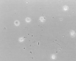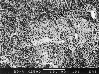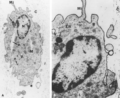 Hyalocytes Reeser and Aaberg106 consider the vitreous cortex to be the “metabolic center” of the vitreous because of the presence of hyalocytes (Figs. 7, 8, and 9). These mononuclear cells are embedded in the vitreous cortex (see Figs. 7 and 9A), widely spread apart in a single layer situated 20 to 50 μm from the ILL of the retina posteriorly and the basal lamina of the ciliary epithelium at the pars plana and vitreous base. Quantitative studies of cell density in the bovine124 and rabbit125 vitreous found the highest density of hyalocytes in the region of the vitreous base, followed next by the posterior pole, with the lowest density at the equator. Hyalocytes are oval or spindle-shaped; are 10 to 15 μm in diameter; and contain a lobulated nucleus, a well-developed Golgi complex, smooth and rough endoplasmic reticula, and many large periodic acid-Schiff (PAS)-positive lysosomal granules and phagosomes.117,126 Hogan and colleagues127 described that the posterior hyalocytes are flat and spindle-shaped, whereas anterior hyalocytes are larger, rounder, and at times star-shaped. Saga and coworkers128 have described that different ultrastructural features can be present in different individual cells of the hyalocyte population in a single eye. Whether this relates to different origins for the different cells or different states of cell metabolism or activity is not clear. Balazs129 pointed out that hyalocytes are located in the region of highest HA concentration and suggested that these cells are responsible for vitreous HA synthesis. There is experimental evidence in support of this hypothesis.130–135 Swann5 claimed that there is no evidence that hyalocytes are responsible for the synthesis of vitreous HA. There is, however, evidence to suggest that hyalocytes maintain ongoing synthesis and metabolism of glycoproteins within the vitreous.136,137 Hyalocytes have also been shown to synthesize vitreous collagen138 and enzymes.139 The phagocytic capacity of hyalocytes has been described in vivo140 and demonstrated in vitro.141,142 This activity is consistent with the presence of pinocytic vesicles and phagosomes126 and the presence of surface receptors that bind IgG and complement.142 Balazs96 has proposed that, in their resting state, hyalocytes synthesize matrix glycosaminoglycans and glycoproteins and that the cells internalize and reutilize these macromolecules by means of pinocytosis. They become phagocytic cells in response to inducting stimuli and inflammation. HA may have a regulatory effect on hyalocyte phagocytic activity.143,144 Fibroblasts There is a second population of cells in the vitreous cortex, which in some cases may be mistaken for hyalocytes. These cells constitute less than 10% of the total vitreous cell population. Several investigations113,145 have determined that these represent fibroblasts, which are present in the vitreous cortex at the vitreous base and adjacent to the optic disc and ciliary processes. The argument for a role in normal vitreous collagen synthesis is mostly by analogy to studies of fibrillogenesis in tendon in which investigations146 have found that secreted collagen molecules are assembled into fibrils within invaginations of secreting fibroblasts. The locations of fibroblasts in the anterior peripheral vitreous (vitreous base and near the ciliary processes) and posterior vitreous may explain how vitreous fibers become continuous structures spanning the distance between these locations. Balazs and associates147 have found that, near the pars plana, vitreous fibroblasts decrease in number with age. Gartner111 has suggested that changes in these cells are responsible for aging changes in the collagen network of the vitreous base. VITREORETINAL INTERFACE The interface between vitreous and the retina posteriorly, as well as the ciliary body and lens anteriorly, consists of a complex formed by the vitreous cortex and the basal laminae of adjacent cells. These basal laminae are firmly attached to their cells,127,148 and vitreous cortex collagen fibrils purportedly insert into the basal laminae.114,145 The only region not adjacent to a basal lamina is the annulus of the anterior vitreous cortex, which is directly exposed to the zonules and the aqueous humor of the posterior chamber. Balazs96 has pointed out the structural similarities between this zone and the surface of articular cartilage, which in joints is exposed to synovial fluid. The significance of such an arrangement in the vitreous is not known, although it probably enables aqueous to enter the vitreous and allows various substances (red blood cells, HA, growth factors, etc.) to exit the vitreous anteriorly. The basal laminae surrounding the vitreous are composed of type IV collagen closely associated with glycoproteins.122,123,149 At the ciliary body, the basal lamina of the pars plicata is a meshwork of lamina densa that is 0.05 to 0.1 μm thick and is organized in a reticular, multilayered structure that is 2 to 6 μm thick and fills the spaces between the crevices of the ciliary epithelium. At the pars plana, the basal lamina has a true lamina densa with insertions of vitreous collagen fibrils. The basal lamina posterior to the ora serrata is actually the basement membrane of retinal Müller's cells, known as the ILL of the retina. Immediately adjacent to the Müller's cells is the lamina rara, which is 0.03 to 0.06 μm thick and demonstrates neither species variations nor changes with topography or age. The lamina densa is thinnest at the fovea (0.01 to 0.02 μm). It is thicker elsewhere in the posterior pole (0.5 to 3.2 μm) than at the equator or vitreous base. At the rim of the optic nerve head the retinal ILL ceases, although the basement membrane continues as the inner limiting membrane of Elschnig.150 This membrane is 50 nm thick and is believed to be the basal laminae of the astroglia in the optic nerve head. At the central-most portion of the optic disc the membrane thins to 20