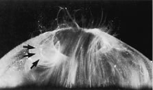 PHYSICAL EXAMINATION Examination of the vitreous essentially consists of visualizing a structure intended to be virtually invisible.158 The clarity of the vitreous and its position within the inner recesses of the eye make clinical examination difficult. Optical transparency necessitates maximizing the Tyndall effect for visualization. Although this can be achieved in vitro (see previous discussion), there are limitations in the illumination/observation angle that can be achieved in vivo. This is even more troublesome in the presence of meiosis, corneal and lenticular opacities, and poor patient compliance. Essential to the success of achieving an adequate Tyndall effect are maximizing pupil dilation in the patient, because the Tyndall effect increases with an increasingly subtended angle between the axis of illumination and the line of observation (up to a maximum of 90 degrees) and dark adaptation in the examiner.159 Some observers160 propose that green light further enhances the Tyndall effect. Direct Ophthalmoscopy With direct ophthalmoscopy, light rays emanating from a point in the patient's fundus emerge as a parallel beam that is focused on observer's retina and an image is formed. However, incident light reaches only the part of the fundus onto which the image of the light source falls, and only light from the fundus area onto which the observer's pupil is imaged reaches that pupil. Thus, the fundus can be seen only where the observed and the illuminated areas overlap and where the light source and the observer's pupil are aligned optically. This restricts the extent of the examined area and also because of a limited depth of field, this method is rarely used to assess vitreous structure. Indirect Ophthalmoscopy Indirect ophthalmoscopy extends the field of view by using an intermediate lens to gather rays of light from a wider area of the fundus. Although binocularity provides stereopsis, the image size is considerably smaller than with direct ophthalmoscopy and only significant alterations in vitreous structure, such as the hole in the prepapillary posterior vitreous cortex (see Figs. 3D and 7), vitreous hemorrhage, or asteroid hyalosis, are reliably diagnosed by indirect ophthalmoscopy. There is also difficulty in examining the peripheral vitreous resulting from a loss of stereopsis because when examining the periphery the circular pupil becomes an elliptic aperture, making it difficult to obtain an adequate view with both of the observer's eyes. This is more of a problem in the horizontal meridians than in the vertical, because the examiner's two eyes are positioned horizontally. Scleral indentation during indirect ophthalmoscopy decreases this difficulty, but more so for peripheral fundus examination than for the vitreous. Slit-Lamp Biomicroscopy The anterior vitreous is easily examined at the slit lamp without preset or contact lenses. In the absence of a crystalline or artificial intraocular lens, vitreous prolapse into the anterior chamber could be important in vitreocorneal touch and the risks of corneal endothelial cell dysfunction.161 Vitreous adhesions to a cataract wound or to the iris may be important in the pathogenesis of postoperative cystoid macular edema.162 Particulate opacities in the anterior vitreous can be seen at the slit lamp and can give important clues as to the possible presence of posterior pathology, such as retinitis pigmentosa.163 Cells can be the augury of retinal infection, inflammation, tears, and/or detachments. Lacqua and Machemer164 described that an increase in the number and size of pigmented cells in the vitreous of patients with retinal detachment (preoperatively or postoperatively) heralds the development of proliferative vitreoretinopathy. Bleeding can be associated with red blood cells in the anterior vitreous. Various neoplastic diseases, for example, endophytic retinoblastoma, choroidal melanoma, and reticulum cell sarcoma, can result in anterior vitreous cells. Anterior vitreous structures such as Mittendorf's dot, a remnant of embryonic hyaloid vessel regression, can be seen at the slit lamp and should alert the examiner to the possibility of other developmental disorders, such as persistent hyperplastic primary vitreous in the fellow eye.165 Effectively using slit-lamp biomicroscopy to overcome vitreous transparency necessitates maximizing the Tyndall effect. Although this can be achieved in vitro, as described previously (and for the anterior vitreous), there are limitations to the illumination/observation angle that can be achieved clinically in the mid- and posterior vitreous. This is even more troublesome in the presence of meiosis, corneal and/or lenticular opacities, and limited patient cooperation. Pupil dilation in the patient should be maximized to achieve an adequate Tyndall effect, because the Tyndall effect increases with an increasingly subtended angle between the plane of illumination and the line of observation (up to a maximum of 90 degrees) and dark adaptation in the examiner. Some observers purport that green light enhances the Tyndall effect, although this has never been explained or tested scientifically. Preset lens biomicroscopy attempts to increase the available illumination/observation angle, offers dynamic inspection of vitreous in vivo, and provides the capability of recording the findings in real-time.166 Initially introduced on a wide scale for use with a Hruby lens and currently practiced by using a hand-held 90.00 diopter (D) lens at the slit lamp, this technique can be performed either with a plano concave lens (e.g., -55.00 to -58.60 D Hruby lenses) or various convex lenses (e.g., +32.00, +58.60, +60.00, or +90.00 D). Plano concave lenses produce a highly magnified, narrow-field, erect image and enable visualization of the posterior pole, although it is difficult to achieve an adequate illumination/observation angle to examine the posterior vitreous. Peripheral examination can be performed only by v