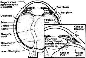 CLINICAL ANATOMY The vitreous body of an emmetropic human eye is approximately 16.5 mm in axial length with a depression anteriorly just behind the lens (patellar fossa). Various structures and regions within the vitreous body are named after the anatomists and histologists who first described them (Fig. 10). The hyaloideocapsular ligament (of Wieger) is the annular region 1 to 2 mm in width and 8 to 9 mm in diameter where the vitreous is attached to the posterior aspect of the lens. Erggelet's or Berger's space is at the center of the hyaloideocapsular ligament. Arising from this space and coursing posteriorly through the central vitreous is the canal of Cloquet (see Figs. 3G and 10), which is the former site of the hyaloid artery. Posteriorly, Cloquet's canal opens into a funnel-shaped region anterior to the optic disc known as the area of Martegiani.
