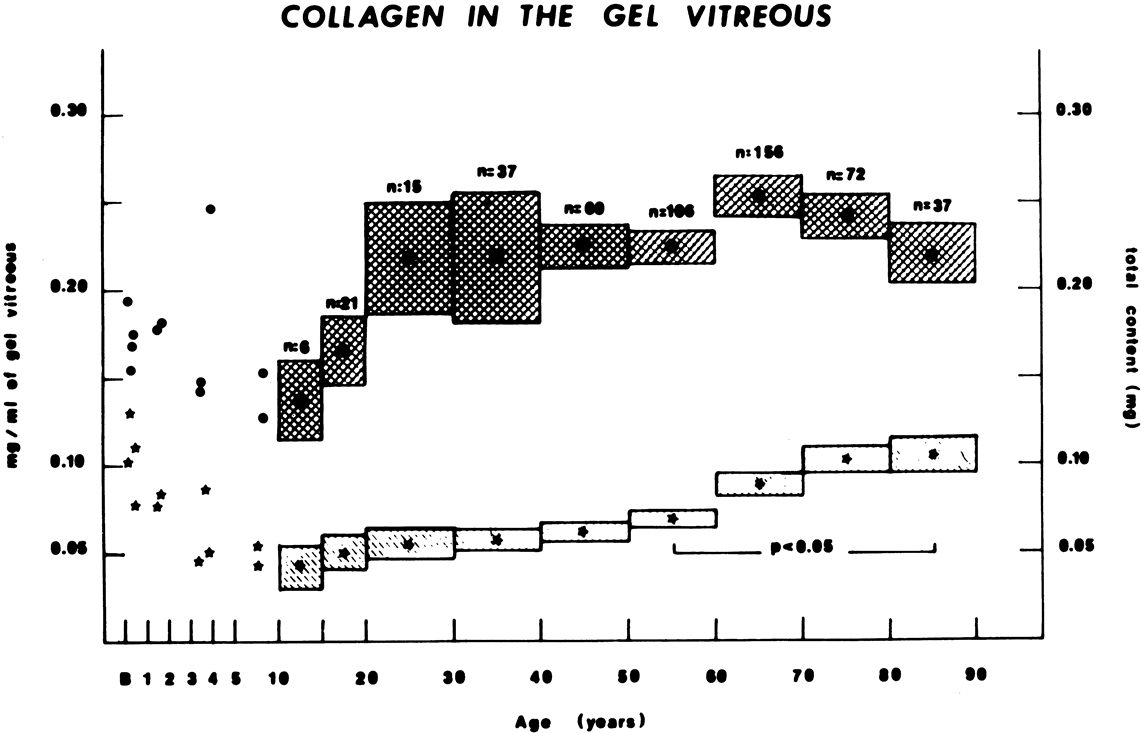 BIOCHEMICAL CHANGES Using slit lamp biomicroscopy in a clinical setting, Busacca75 and Goldmann76 observed that after the ages of 45 to 50, there is a decrease in the gel volume and an increase in the liquid volume of human vitreous. Eisner77 qualitatively confirmed these clinical findings in his postmortem studies of dissected human vitreous and observed that liquefaction begins in the central vitreous. In a large autopsy study of formalin-fixed human eyes, O'Malley78 provided quantitative evidence to support these observations. He found that more than half of the vitreous body was liquefied in 25% of persons age 40 to 49 and that this increased to 62% of those age 80 to 89. Oksala79 used ultrasonography in vivo to detect echoes from gel-liquid interfaces in 444 normal human eyes and found progressive liquefaction with age. Vitreous liquefaction actually begins much earlier than the ages at which clinical examination or ultrasonography detects changes. Balazs and colleagues80,81 found evidence of liquid vitreous after age 4 and observed that by the time the human eye reaches its adult size (ages 14 to 18) 10% to 12.5% of the total vitreous volume consists of liquid vitreous (Fig. 2). In these postmortem studies of 610 fresh, unfixed human eyes, it was observed that after age 40, there is a steady increase in liquid vitreous that occurs simultaneously with a decrease in gel volume. By the ages of 80 to 90 years more than half the vitreous body is liquid. The finding that the central posterior vitreous is where liquefaction begins77 and where fibers are first observed82–84 is consistent with the concept that dissolution of the hyaluronic acid (HA)–collagen complex results in the simultaneous formation of liquid vitreous and aggregation of collagen fibrils into bundles of parallel fibrils seen as large fibers.83 In the posterior vitreous, such age-related changes often form large pockets of liquid vitreous.85 Age-related rheologic changes in the vitreous may result from an alteration in HA-collagen interaction. Chakrabarti and Park86 claimed that the interaction between collagen and HA is dependent on the conformational state of each macromolecule and that a change in the conformation of HA molecules could result in vitreous liquefaction and aggregation or cross-linking of collagen molecules. Armand and Chakrabarti87 detected differences in the structure of the HA molecules present in gel vitreous and those in liquid vitreous, suggesting that such conformational changes occurred during liquefaction. Whether these changes are cause or effect is not known. However, Andley and Chapman88 demonstrated that singlet oxygen can induce conformational changes in the tertiary structure of HA molecules. Ueno and associates52 suggested that free radicals generated by metabolic and photosensitized reactions could alter HA and/or collagen structure and trigger a dissociation of collagen and HA molecules, ultimately leading to liquefaction. This is plausible because the cumulative effects of a lifetime of daily exposure to light may influence the structure and interaction of collagen and HA molecules by the proposed free radical mechanism(s). Enzymes, such as endogenous metalloproteinases, may also be involved in liquefying the gel vitreous. The importance of vitreous liquefaction in the pathogenesis of posterior vitreous detachment is discussed below. Total vitreous collagen content does not change after the ages of 20 to 30 (Fig. 3). However, the collagen concentration in the gel vitreous at the ages of 70 to 90 (approximately 0.1 mg/mL) was found to be significantly greater than at the ages of 50 to 60 (slightly more than 0.05 mg/mL; p < .05). Because the total collagen content does not change, this finding is most likely due to the decrease in the volume of gel vitreous that occurs with aging (see Fig. 2) and a consequent increase in the concentration of the collagen remaining in the gel. The collagen fibrils in this gel become packed into bundles of parallel fibrils,83 perhaps with cross-links between them. Aging of collagen throughout the body is associated with increased cross-linking as manifested by decreased solubility,89 increased collagen “stiffness,”90 and increased resistance to enzymatic degradation.91 There is also an increase in a reducible lysine-carbohydrate condensation product with increasing age.92 Although similar investigations have not been performed on vitreous collagen, studies by Snowden and colleagues93 demonstrated that with aging, there is a decrease in the quantity of bovine vitreous collagen solubilized by heat alone. This could result from an increase in collagen cross-linking or, as suggested by the authors, from changes in the surrounding glycoproteins and proteoglycans. Abnormal collagen cross-links have been identified in diabetic human vitreous,94 suggesting “precocious senescence” of vitreous collagen as has been described for other organs and tissues in diabetic patients.95–97 Vitreous HA concentration increases until about the age of 20, when adult levels are attained (Fig. 4A). HA concentration does not change in either the liquid or gel vitreous from ages 20 to 60 (Fig. 4).81,98 This necessarily means that there is an increase in the HA content of liquid vitreous and a concomitant decrease in the HA content of gel vitreous, since the amount of liquid vitreous increases and the amount of gel vitreous decreases with age (see Fig. 2). This is consistent with the concept that vitreous liquefaction is associated with a “redistribution” of HA from the gel to the liquid vitreous. With advanced liquefaction, there is a marked increase in the concentration of HA in liquid vitreous at ages 70 to 90 (Fig. 4B). Vitreous soluble protein concentrations also increase from 0.5 to 0.6 mg/mL at ages 13 to 50, to 0.7 to 0.9 mg/mL at ages 50 to 80, and to 1.0 mg/mL above the age of 80.80,81,98 This increase may result from an age-related breakdown in the blood–o