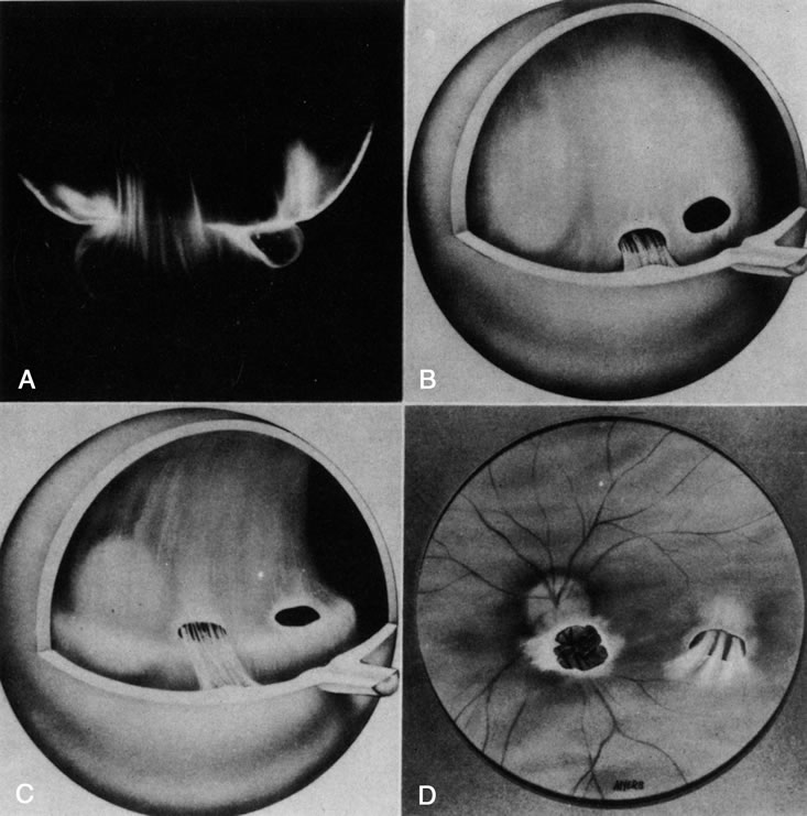 and removal in curing the disease. Macular Hole There has recently been considerable discussion on the role of vitreous traction in macular hole formation and the nature of such traction. In the formation of spontaneous macular holes, sometimes called senile or idiopathic, there is an operculum lying immediately in front of the macular hole and no PVD in approximately 25% of cases.172 In these patients, vitreous traction is localized at the fovea due either to “tangential” contraction of the prefoveal vitreous cortex175 or to sagittal traction transmitted to this site by intravitreal fibers.64 In the latter case, vitreous fibers are sometimes seen attached to an operculum after the macular hole is formed.174–178 Gass was the first to propose that “tangential” prefoveal vitreous traction is the primary cause of spontaneous macular holes.172,175 Johnson and colleagues179 recently refined this concept by proposing that the cause of this traction is perifoveal vitreous detachment, localizing onto the fovea the dynamic vitreous traction associated with ocular saccades. According to Gass, this traction, by whatever mechanism, causes a retinal detachment localized to the fovea with radiating retinal folds (stage 1), whereas others believe that there is central cyst at this stage.180 Indeed the Paris group has proposed that foveal pseudocyst is the first step in macular hole formation.181,182 As a result of these changes, there is greater visibility of xanthophyll pigment, accounting for a central yellow spot (stage 1A) or ring (stage 1B). There is also a negative Watzke's sign at this stage. Several weeks later, a single or several minute holes develop near the center of the fovea (stage 2). These holes continue to enlarge, at times in a “can-opener” fashion, over the ensuing weeks and months until an operculated full-thickness hole develops (stage 3). If a PVD occurs, an operculum can be found attached to the posterior vitreous cortex in the midvitreous (stage 4). There are reports that this is actually a pseudo-operculum, but recent studies in London with optical coherence tomography support the possibility that, at least in some cases, a significant amount of retinal tissue is torn from the foveal area during macular hole formation.183 In 10% of cases, a true PVD occurs before stage 2 develops and patients experience spontaneous resolution of symptoms. In the majority of cases, however, the PVD is anomalous, as substantiated by the intraoperative finding of a preretinal membrane composed mostly of posterior vitreous cortex. An explanation for the claim that there is PVD preoperatively even though preretinal membranes are found at surgery is that there is a split in the posterior vitreous cortex with persistent attachment of the outer layer of the split vitreous cortex to the macula and anterior displacement of the anterior wall of this vitreoschisis cavity. In this disorder, anomalous PVD results from excess liquefaction of vitreous without concomitant weakening at the vitreoretinal interface and the consequent traction causes a split in the posterior vitreous cortex, known as vitreoschisis. This phenomenon has been described in proliferative diabetic vitreoretinopathy184 and may well be a factor in the pathogenesis of macular holes. An alternate hypothesis describes that PVD can actually contribute to the pathogenesis of macular holes.185 Deficient choroidal blood flow and ischemia to the retinal pigment epithelium and fovea (step 1) initiate spontaneous macular hole formation. Cystic changes subsequently develop in response to this ischemia (step 2). The development of atrophic changes in the fovea (step 3) then results in “involutional macular thinning.” In step 4, PVD is believed to pull on this susceptible, thinned fovea, causing a macular hole. To support this hypothesis, the authors cited the finding that in their study, 10 out of 12 eyes (83%) with involutional macular thinning that developed PVD experienced a full-thickness macular hole. This was also noted by McDonnel and colleagues,186 who found that 11 out of 22 eyes (50%) with macular cysts developed a macular hole following PVD. The results reported by Frangieh and associates177 support the concept of a role for PVD in the development of macular holes. In their series of 35 cases with lamellar or full-thickness holes, partial or complete PVD was present in all 35 (100%) of the eyes. Vitreous fibers were found inserting to the macula or onto a detached operculum in eight out of 35 eyes (22.8%). Margherio and Schepens176 found evidence of vitreous traction in 36 out of 56 eyes (64.2%) with macular holes. Since macular hole surgery was first devised by Kelly and Wendel,187 many patients have benefited from this innovation. Recent modifications of their original approach include attempts to dissect away the ILL of the retina. There are reports that this increases surgical success rates,188 which is understandable because by removing the ILL, one assures that the posterior vitreous cortex no longer exerts untoward effects on the central macula. Due to the tenacious attachment of Müller cells to the ILL, it is inconceivable that if the entire ILL were being dissected off the retina, the postoperative vision would be undisturbed. Thus, it is far more likely that only the inner lamina (lamina rara interna) or, at the most, the inner and central (lamina densa) laminae are being dissected away, leaving the lamina rara externa and intact Müller cells behind. PREMACULAR MEMBRANES Premacular membranes arise from cell proliferation at or near the optic disc that extends into the macula. Vision is affected because of disruption of macular anatomy. However, this does not occur in all cases, since evidence of abnormal proliferation at the optic disc has been found in about one-half of normal human autopsy eyes.189 The high prevalence of cell proliferation at this site may be due to the absence of a true basal lamina at the o