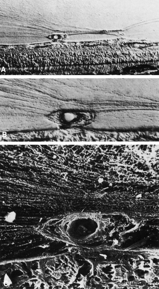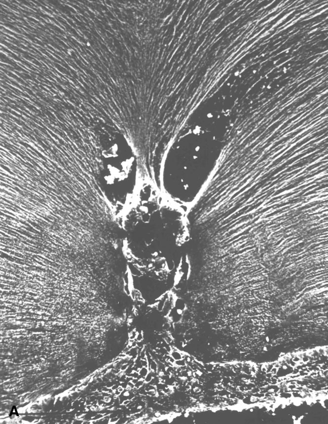 a useful way to conceptualize all vitreoretinal disorders. In 1904, Best134 emphasized that every movement of the eye results in movement of the vitreous body and that this causes traction at any point of strong vitreoretinal adhesion. Normally strong adhesion occurs at the vitreous base, disc, and macula; over retinal vessels; and often as a sheetlike adhesion in the posterior pole of young persons.135 The following describes how anomalous PVD results in traction and the various vitreoretinal pathologies observed in humans. The spectrum of disorders can be categorized into two large groups: disruptions of retina and disruptions of vitreous. RETINAL DISRUPTION IN ANOMALOUS PVD Peripheral Traction Schepens136 first described the clinical appearance of peripheral vitreoretinal traction as “white with or without pressure.” White with pressure refers to the appearance of the peripheral fundus when examined during scleral depression, and white without pressure is the appearance without scleral depression. Daicker137 proposed that these appearances result from “collagenic” formations in the peripheral retina, whereas Gartner138 suggested that they are due to irregularities of the internal limiting lamina. Green139 described that the appearance of these lesions results from incident light (from the ophthalmoscope) that is tangential to dense bundles of vitreous collagen. There are those who consider that these findings predispose to peripheral retinal tears.137 However, Byer140 does not believe that this ophthalmoscopic appearance has any diagnostic or prognostic significance. Watzke141 performed clinicopathologic correlation of a case with this finding and described that the lesion was due to portions of the vitreous cortex that remained attached to the retina following PVD. This would therefore represent a variant of vitreoschisis (splitting of the vitreous cortex), in this instance, at the peripheral fundus. Peripheral Retinal Tears Because the vitreous base is the site of strongest vitreoretinal adhesion, it is here, usually at the posterior border, that vitreoretinal traction causes peripheral retinal tears. Green139 reviewed many clinical and postmortem studies on the prevalence of peripheral retinal tears. Clinical studies found retinal tears in 0.59% to 7.2%, whereas autopsy studies showed a prevalence from 3.3% to 8.8%. Other studies have focused on the relationship between PVD and peripheral retinal tears. Autopsy studies found that PVD is associated with retinal breaks in 14.3% of all cases.142 Clinical studies found retinal tears in 8% to 15% of eyes with acute PVD.143–145 Lindner111 and Jaffe112 found that retinal tears occurred in the superior fundus in over 94% of cases. In the presence of high myopia (greater than –6 D), PVD is associated with peripheral retinal breaks in 11.1%.143 In high myopes who underwent uncomplicated cataract extraction (presumably by intracapsular techniques), the prevalence of retinal breaks following PVD was as high as 16.2%.144 Clearly, in all these cases, the PVD was anomalous. In 1957, Teng and Chi145 claimed that “irregularities” of the vitreous base are responsible for the vitreoretinal traction that results in peripheral retinal tears. It is known that at the vitreous base, there are collagen fibrils oriented perpendicular to the wall of the eye,138,139,146 with insertions anterior and posterior to the ora serrata.82,147 Gartner100 found that with aging, there is aggregation of the collagen fibrils of the vitreous base similar to the aggregation of collagen fibrils seen within the central vitreous.84 Various conditions of the peripheral retina that are associated with increased vitreoretinal traction include meridional folds, peripheral pigment clumps, retinal rosettes, granular patches, and progressive lattice-like degeneration.144–152 Recently, two structures have been identified (Fig. 10) that are probably remnants of the fetal vasculature in the primary vitreous and are likely to play a role in transmitting traction to the peripheral retina.153