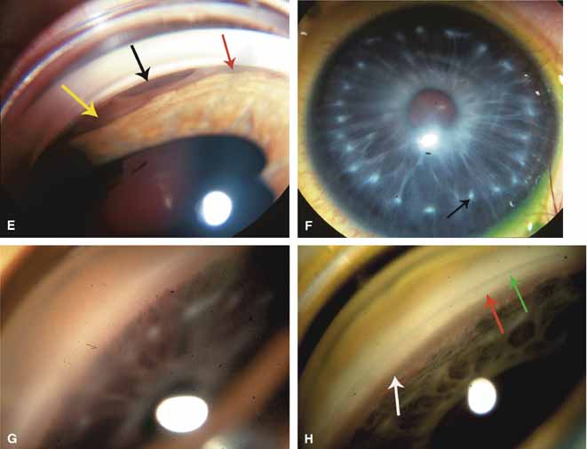 The Shaffer system is based on the width of the angle recess (see Fig. 10B and Table 2).21 The Spaeth nomenclature is a hybrid alphanumeric arrangement (see Fig. 10C to 10F).22 This system prompts the examiner to describe the angle in a three-dimensional manner. This allows total reconstruction of the angle by anyone who understands the nomenclature. For example, a grade IV Shaffer angle is wide open and a Spaeth D40p is also wide open. However, even though they are both wide open, the Spaeth system reveals a plateau configuration that requires closer scrutiny. Grade the following angles (Fig. 11). |