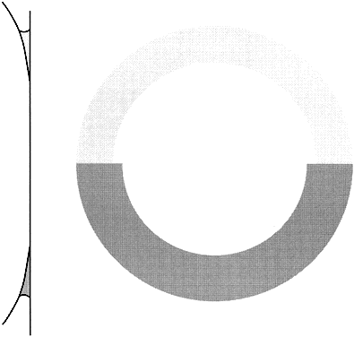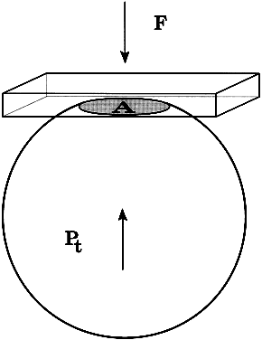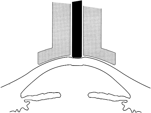 generally use indirect measurements of IOP—tonometry. The pressure inside a flexible sphere can be estimated by using fixed forces to create measurable deformations of the wall or, conversely, by using variable forces to produce predetermined deformations of the sphere wall. Both approaches have been used in tonometry of the eye. The methods used are based on the Imbert-Fick principle, which states that if a plane surface is applied to a spherical membrane to cause a flattening of surface area, the pressure inside the spherical membrane will be equal to the applied force divided by the area of contact (Fig. 1).1,2 It must be emphasized that the Imbert-Fick principle is considered valid when the sphere is perfectly round, dry, elastic, and infinitely thin. Because the wall of the eye is none of these, application of the Imbert-Fick principle to tonometry requires careful attention to variations caused by the fundamental nature of the ocular tissues and to careful calibration of all tonometers in the laboratory.