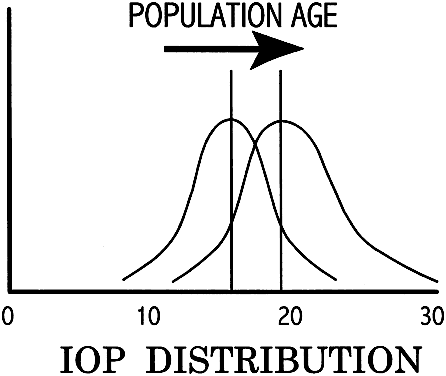 Although the Goldmann tonometer is generally used at the slit lamp, the principle is not exclusive to that arrangement. Portable tonometers based on this principle (e.g., the Perkins tonometer8 and Draeger tonometer9) allow the increased accuracy of the Goldmann technique to be brought to the bedside, operating room, and glaucoma-screening setting. These portable applanation tonometers are especially useful in young children who may be frightened and restless at the slit lamp. Other tonometric instruments are available. It is a credit to the design and precision of the Goldmann instrument that virtually all new tonometers are evaluated in comparison with it. The air-puff tonometer (American Optical) works on an applanation principle in which the force required to flatten a portion of the cornea is delivered in a carefully calibrated bolus of air rather than through mechanical contact.10 The moment of flattening is recorded optoelectronically and converted into an estimate of IOP by a computer in the machine. This instrument is especially useful when many patients need to be screened or it is desirable or necessary to avoid topical anesthesia. When the cornea is scarred, irregular, or edematous, it is useful to have a tonometer available that does not depend on an optical end point for its measurement. Two instruments are useful in this instance: the Mackay-Marg tonometer11,12 and the Pneumotonometer.13 The Mackay-Marg tonometer has a central piston, with provision to sense force surrounded by a passive annulus (Fig. 5). This instrument is brought up to the cornea by hand and the force necessary to applanate the cornea to the diameter of the central piston is determined by an electronic display.14 In the Pneumatonometer, a plunger is also brought up to the cornea by hand but the actual force of application is supplied by compressed gas. A valving mechanism at the tip of the plunger determines the end point for the measurement; the gas pressure necessary to achieve the end point is sensed and displayed electronically.15 Laboratory and clinical studies have shown that the Pneumatonometer causes some degree of indentation.16,17 An alternative method of applanation tonometry involves the application of fixed forces, with subsequent measurement of the area applanated. This can be done simply with small weights that have a flat surface. The area flattened by a particular weight can be determined either from staining patterns on the face of the weight (Maklakoff instrument); if the applanating surface is transparent, it can be determined from direct visual observation of the flattened area (Halberg instrument).18 NORMAL PRESSURE In the normal young adult population, the mean of IOP readings lies between 15 and 16 mmHg, with a distribution that is bell-shaped and symmetric (Fig. 6).19 With increasing age, most studies indicate a tendency toward increased IOP, with skewing of the distribution toward higher pressures.20 Conversely, IOP in normal infants and children tends to run lower than that of the young adult population.21 CIRCADIAN VARIATION IN INTRAOCULAR PRESSURE Intraocular pressure shows a natural cycle, with a phase of relative elevation followed by a phase of relative depression occurring over a 24-hour period—a circadian rhythm.22 The mechanism for this variation almost certainly involves variations in aqueous humor production, although other factors contribute also. The magnitude of the variation is greater in glaucoma patients—in some studies, three or four times greater than in the normal population (Fig. 7). The larger pressure swing in glaucoma patients is logically related to poor outflow facility but because outflow facility and diurnal variation of IOP are not highly correlated, other factors also must play a role. The most common daily cycle shows a tendency for higher pressures in the morning hours and falling pressures in the evening. This pattern is not universal, however, because peak pressures occur at any time of the day. Careful studies of IOP using home tonometry23 to track patients' normal daily patterns have shown that about 50% of peak pressures fall outside normal office hours.24 The practical consequences of circadian variation in IOP are several. First, no single reading of IOP can be considered to be representative. Likewise, no change in pressure should be labeled a therapeutic success or failure unless diurnal variation has been carefully considered. There are several practical approaches to this problem (Table 1).