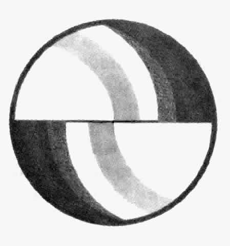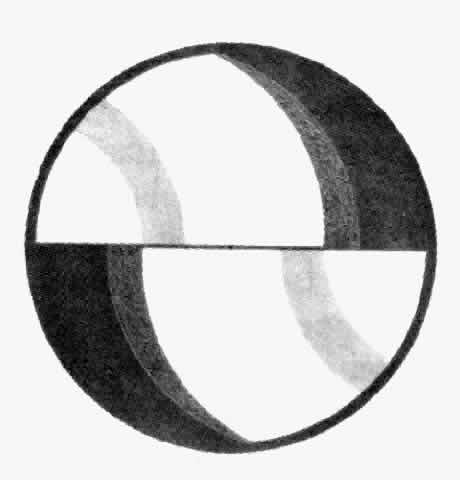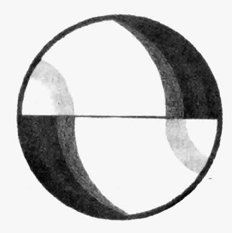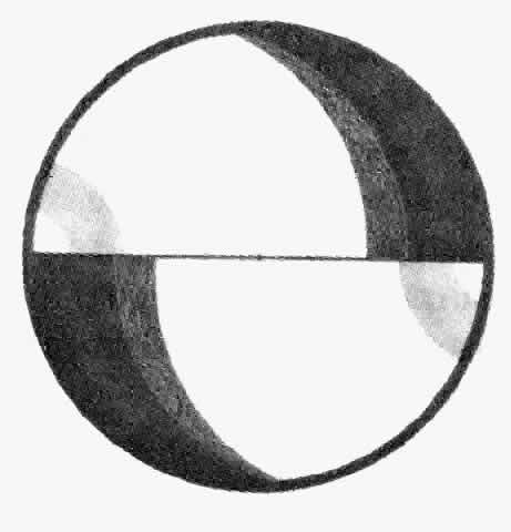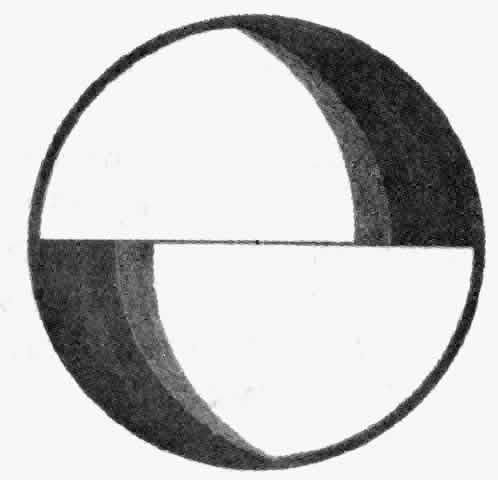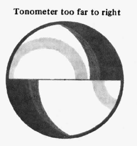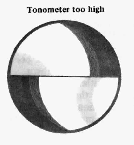 with a transmissible organism). The Goldmann tonometer is used in conjunction with a slit-lamp biomicroscope to which one of two types of Goldmann tonometers can be attached. The following description is written with the Haag-Streit slit lamp in mind. The principles may easily be applied to other biomicroscopes. The slit lamp is adjusted for the examiner. Low-power oculars are preferable, and the objective lens is also set at its lowest power. The examiner may choose to align the optical portion of the tonometer with either the left objective or the right objective of the biomicroscope, depending on his own ocular dominance. The front surface of the prism is wiped with water and dried with a clean tissue. Hexachlorophene or other detergents should not be used, since residue on the prism may be toxic to the cornea. The biprism is adjusted such that the interface between the two prisms is oriented horizontally. If a high degree of corneal astigmatism is present in the subject's eye, the axis of the interface should be set 43° from the flattest axis of the cornea. The examiner estimates the pressure in the eye and sets the dial of the tonometer to the estimated pressure. (The scale reading in grams multiplied by 10 equals the pressure in millimeters of mercury.) The blue filter is introduced into the light path, and the slit is opened to its widest position. The light must be sufficiently oblique from either side to illuminate the tip of the prism and not cause interfering reflections. Corneal anesthesia is required for accurate tonometry in most subjects. Proparacaine hydrochloride 0.5% is suitable. After instillation of the anesthetic, fluorescein can be added to the tear film by touching the everted lower tarsal conjunctiva with a moistened strip of fluorescein-impregnated paper. Alternatively one can use an anesthetic such as 0.4% benoxinate hydrochloride, which contains 0.25% fluorescein sodium. In either case it is not necessary to use more than a small amount of fluorescein to observe the inner margins of the meniscus of contact between the cornea and the tonometer. If argon laser treatment is to follow tonometry the same day, the least amount of fluorescein should be applied that permits visualization, and the fluorescein should be washed away with an irrigating solution immediately after tonometry. (Fluorescein absorbs the 488-nm wavelength of argon lasers.) If anesthetics cannot be instilled because of allergy, an experienced examiner can warm the tip with water to slightly above body temperature and perform tonometry without anesthesia. The slit lamp is adjusted so that the patient is comfortable. A tight collar or necktie should be loosened. The patient is asked to stare straight ahead and to resist the natural tendency to blink. The slit lamp is moved in order to approach the cornea along the optic axis. With the joystick held back, the entire examining unit of the slit lamp (including the tonometer) is moved to a position approximately 2 mm to 3 mm anterior to the cornea. The initial position should be inferior to the visual axis in order to make it possible to slip under the eyelashes of the upper lid without touching them. If necessary the upper lid should be lifted gently. The tonometer is then raised until the prism is centered. At this point the examiner begins to look through the biomicroscope. The reflected image of the tip of the tonometer can be used to guide the alignment of the tip even before contact is made. The image appears as hint purple arcs that move as the position is adjusted. When these arcs appear symmetric in the two halves of the biprism, the instrument is aligned correctly (Figs. 1 THROUGH 9). The joystick is moved forward slowly. Just before the corneal surface is touched, the arcs will meet.