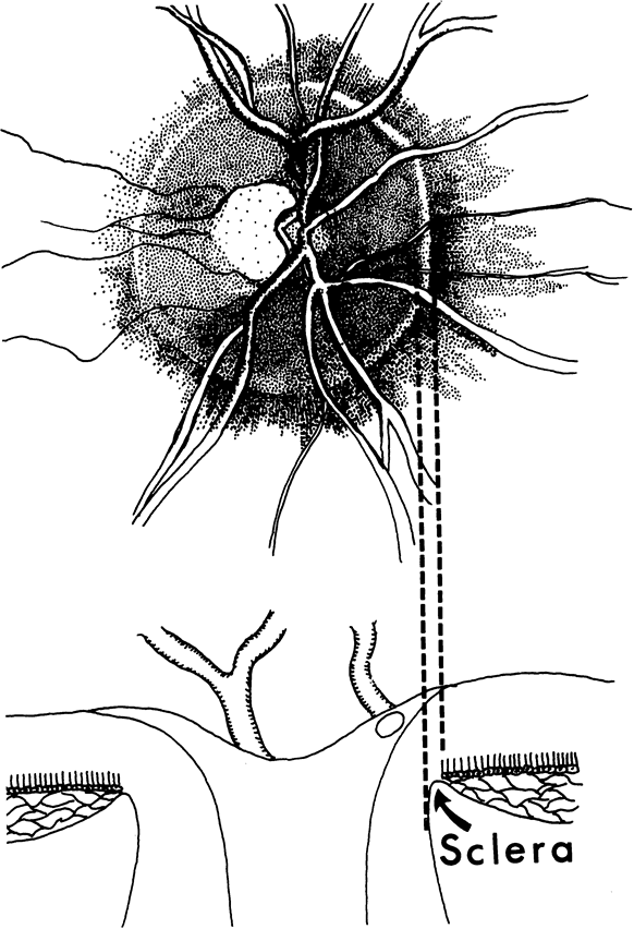 The axons maintain an orderly grouping in the retina as bundles partitioned by sheets of Müller's cells.1–3 A sheen reflected from the many bundles taking parallel courses gives the retina a striated appearance4 that is most prominent where the nerve fiber layer is thickest near the disc, especially in the arcuate bundles arriving at the poles of the disc from the temporal arcades.5,6 The attentive observer can see the striae of light reflected from these bundles and recognize their partial or total absence when bundles of axons disappear in glaucomatous or other forms of optic atrophy.4,7–10 The backscatter of light is determined by the cylindric nature and size of the light-scattering structures, possibly the axonal microtubules. They produce reflection with directional, spectral, and polarization (retardation) properties that have been studied and quantified, providing a basis for measuring the integrity of the retinal nerve fiber layer.11–14 The manner of layering of axons within intraretinal bundles2,3,6,15 may not be exactly the same in all primate species. However, a basic orderliness is present in the retina and seems to be maintained in the chiasm and beyond to the lateral geniculate body.16–19 Discrete scotomas and other defects caused by damage to nerve fiber bundles are produced by localized insults in the retinal nerve fiber layer or in the optic nerve head. Diffuse pressure on the posterior optic nerve by a mass lesion typically produces a central scotoma or diffuse visual dysfunction, but occasional instances of more localized damage in this region produce well-localized nerve fiber bundle defects, attesting to the existence of orderly bundles in this region also.12–15 On arriving at the lateral geniculate body, the axons are still organized and synapse in an orderly array. In the retinal nerve fiber layer, axons converge from every direction toward the optic disc and turn to enter the optic nerve through an opening in the outer retina, the choroid, and the sclera. The features and anatomic variation of the normal optic nerve head, or optic disc, are illustrated in Figures 2, 3, 4, 5, 6, 7, 8, 9, 10, 11, 12, 13, 14, 15, and 16. A physiologic excavation (cup) results if the chorioscleral canal is larger than required for the approximately 1 to 1.5 million axons and the supporting glial cells and blood vessels. The size of the excavation depends on how ample is the size of the chorioscleral canal.20,21 In discs where the chorioscleral canal matches the number of axons, the chorioscleral canal itself is typically somewhat taller than it is wide (Figs. 2 and 3). However, because the number of nerve fibers entering the upper and lower poles of the disc is greater than in the temporal and nasal sectors, the boundary of the physiologic cup is more or less circular.22 When the disc is large, it may be nearly circular but the cup likewise nearly circular. However, except in discs of anomalous shape, the width of the rim of neuroretinal tissue is noted in normal, nonglaucomatous optic discs to be greatest in the inferior meridian followed by the superior meridian, and narrowest in the temporal quadrant.23 The shape of the physiologic cup is affected by the obliquity of the wall of the canal through the choroid and sclera. The wall of the cup is steep where the wall of the canal is angled outward.24 Where the canal has a wall perpendicular to the ocular coats the cup has a sloping wall (Fig. 4). The slope of the cup may vary from one sector to another, and there is considerable individual variation in the size and shape of the chorioscleral canal and therefore of the optic cup. In many eyes, the optic nerve exits through a canal the passes nasally and upward into the orbit, so that the upper nasal neuroretinal rim is bounded by a steep wall when viewed from the ophthalmoscopic viewpoint, while the lower temporal wall is of the cup is sloped, so that ophthalmoscopically the cup wall is, in essence, being viewed from within the cup rather than from above. In other discs, particularly those with a large cup, the walls are perpendicular to the scleral wall in all meridians. There is also typically no evident slope of the exit canal in eyes with only a small dimple of a cup, resulting from a near-perfect match between the size of the chorioscleral canal and the amount of neuroretinal tissue (axons and glia) that comprise the optic disc. The normal anatomic variations were noted and classified by Eschnig,25 and the glaucomatous changes to be discussed below are superimposed on the anatomic character present natively. The canal through which the optic nerve exits from the eye traverses several layers of peripapillary tissue: the outer retina, the pigment epithelium, Bruch's membrane, the choriocapillaris, the outer choroid, and the sclera. In nearly all human eyes, in all or some meridians, a flange of sclera extends as far forward as the pigment epithelium, forming something of a border for the canal,25,26 and this can be seen ophthalmoscopically as a scleral rim around the disc (Figs. 5, 6, and 7). With or without such an obvious flange, the several chorioretinal layers may not be perfectly aligned with one another. Perhaps most typically, as the optic nerve exits obliquely in an upper nasal direction, the lower temporal sector of the disc viewed ophthalmoscopically is seen to have a crescent of misaligned edges of the several chorioretinal layers, such that the outer choroid and sclera may be left uncovered by the choriocapillaris and pigment epithelium (Fig. 8). Because of the tilt, the scleral flange is not seen as a narrow band; instead, by ophthalmoscopy its inner surface is viewed obliquely as it merges with the optic nerve sheath. In some myopic eyes, the crescent is most extensive on the temporal side, and in other eyes the crescent may be directly inferior, or for that matter less frequently in almost any position. In yet other variations the crescent encompasses much 