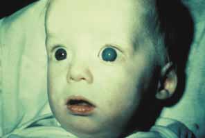 Signs and symptoms of glaucoma in an infant differ from those of an older child or adult because of the elastic response of the infant eye to elevated intraocular pressure. Infants often present with epiphora, photophobia, and blepharospasm because of corneal stretching, ruptures of Descemet's membrane, and edema.10 The child may become irritable and so photophobic that he or she will bury his or her face to avoid light. Parents may notice haziness and enlargement of the eye and may initially consider the large eyes an attractive feature rather than a warning sign of glaucoma. |
