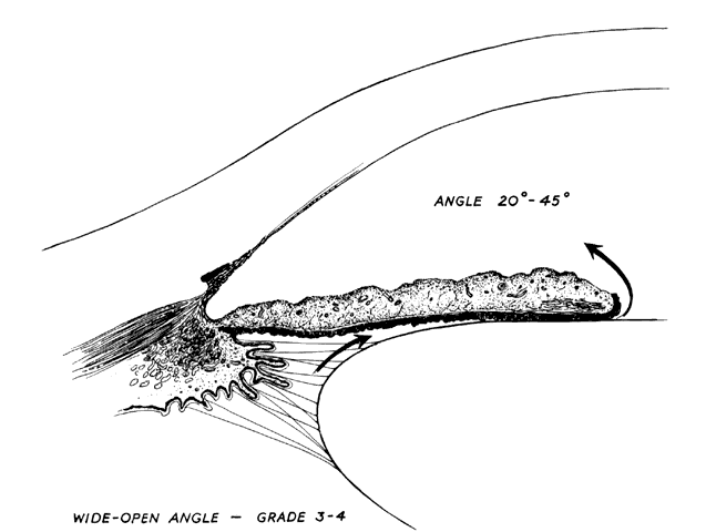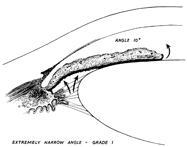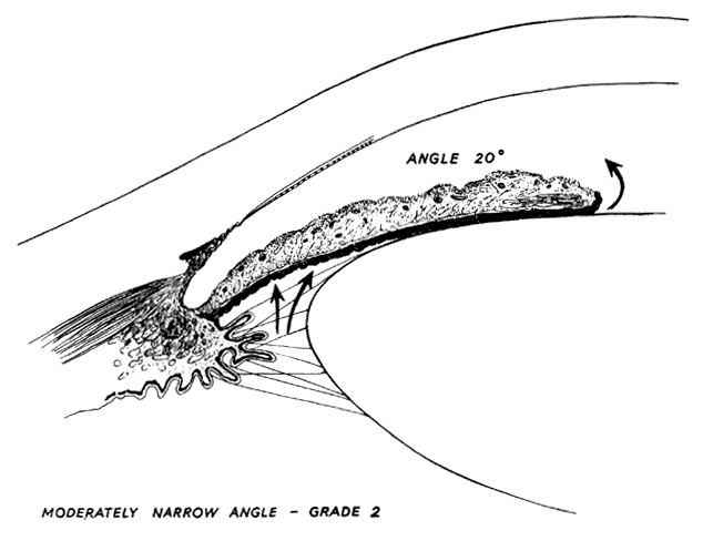 ANATOMIC FACTORS Several anatomic features predispose an eye to primary angle-closure glaucoma. These relate to the size and shape of the eye, its cornea, anterior chamber, angle, lens, iris, and ciliary body. The Eye Ultrasonographic measurements have shown that eyes with primary angle-closure glaucoma have an average axial length 1 mm shorter than normals.16,17 Hyperopes are therefore more predisposed than emmetropes or myopes to angle closure. However, myopia does not preclude the development of angle closure.18 The Cornea The corneal radius of curvature and diameter are usually smaller than average in primary angle-closure glaucoma eyes. There is a tendency for corneae with smaller diameters to have steeper curvatures, which partially compensate for the change in refractive power.19 The Anterior Chamber The central anterior chamber in eyes with angle closure appears to be 1 mm shallower, on average, than that in normal eyes. It seems that the 1 mm shallowing of the anterior chamber is caused by increased volume and forward positioning of the lens.20 Eyes with anterior chamber depth greater than 2.5 mm seldom develop angle closure. According to Barkan,21 the central anterior chamber depth was less than 1.5 mm in 75% of angle-closure glaucoma cases. It should be emphasized that the depth of the anterior chamber can vary in a given individual and in a given eye. Generally, the anterior chamber becomes more narrow with advancing age. A patient seen with a moderately narrow angle at age 50 is likely to have a much more narrow angle at age 60, and perhaps a dangerously narrow angle at age 70 or 80. This appears to be due to increasing size of the crystalline lens with age and perhaps to increasing laxity of the zonules, which allows the lens-zonular diaphragm to move anteriorly. In addition, variations in angle depth can occur as aqueous production alters. Chandler and Grant frequently observed that an angle that is anatomically extremely narrow or closed could be opened and appear wide and nonoccludable when aqueous production was markedly reduced, such as when carbonic anhydrase therapy was instituted. Thus, a patient treated for angle-closure glaucoma in one eye might be misdiagnosed as having a nonoccludable angle in the fellow eye when, in fact, the fellow eye was extremely narrow before treatment with carbonic anhydrase inhibitors. There may be variation in the angle depth with any therapeutic agent that alters aqueous production. Similar effects could be produced as a result of other variations in aqueous production, such as the reduction in aqueous humor production after contusion to the eye, choroidal separation, or chronic uveitis. The Lens The average axial lens thickness is 0.6 mm greater in angle-closure glaucoma eyes compared with normals. Axial thickening of the lens and its forward displacement due to laxity of the zonules increases with age. The lens size relative to the anterior chamber volume may bring about shallowing of the anterior chamber. An eye with a normal size anterior segment may develop anterior chamber shallowing with an unusually large lens. This same effect may be seen with a normal size lens in a small anterior segment. In addition, ultrasonographic measurements of the radius of curvature of the anterior lens surface is on average 2.3 mm steeper in angle-closure glaucoma eyes than normals.22 The Angle There are several classifications that have been developed in an attempt to identify those patients at risk for angle closure. Van Herick15 developed a slit lamp grading system based on the depth of the peripheral anterior chamber as measured by the adjacent corneal thickness seen in the slit lamp beam directed at the limbus. In van Herick's system, a grade 1 depth is the narrowest and a grade 4 depth is a deep anterior chamber. When a grade 1 or 2 depth is present, that is, peripheral anterior chamber depth less than one half corneal thickness, gonioscopy should be performed to rule out occludable angles. Scheie's23 grading system is based on the depth of angle structures visible on gonioscopy with a grade IV angle being narrow and visible only to Schwalbe's line. Shaffer developed the following classification for describing angle width and the likelihood of angle closure. If an angle recess width is 20 degrees or more, angle closure is improbable (Fig. 1). Angles between 10 and 20 degrees have an increased risk of developing angle closure (Fig. 2). Below 10 degrees, angle closure is probable or actually present (Figs. 3 and 4).24 When evaluating an angle, however, it is also necessary to consider the peripheral iris configuration and iris root insertion.25 Spaeth developed a gonioscopic classification system based on three elements: (1) the angle width in degrees; (2) the configuration of the peripheral iris; and (3) the insertion of the iris root.26