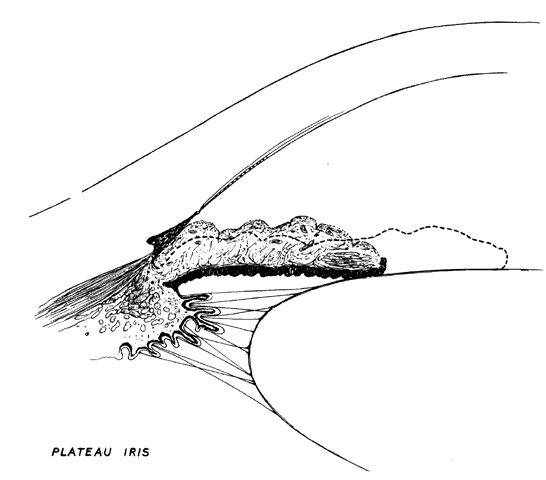 pupillary block. The iris moves slightly back and the angle reopens. Infrequently, eyes with well-documented primary angle closure will not respond to peripheral iridotomy. These are rare syndromes with peculiar features deserving separate consideration. PLATEAU IRIS CONFIGURATION AND SYNDROME This relatively rare condition is a form of primary angle-closure glaucoma in which the plateau configuration of the iris (described earlier under anatomic considerations) is primarily responsible for the angle closure. In plateau iris, little or no relative pupillary block is present. After spontaneous or pharmacologic pupil dilation, the peripheral iris crowds and occludes the angle. Clinically, this entity presents as acute or subacute angle-closure glaucoma in individuals of either sex. An attack of angle-closure glaucoma may follow spontaneous or pharmacologic mydriasis. Gonioscopy shows plateau iris configuration. The angle will be closed when the pupil is dilated, but the angle will reopen when the pupil is made miotic with miotic therapy or strong light. Laser iridotomy should be performed on such eyes to eliminate the presence of any degree of relative pupillary block. In some such eyes, the angle will retain its plateau configuration but will widen enough to prevent reclosure with mydriasis after iridotomy. No further therapy is needed other than periodic observation to be sure the angles remain open as expected. We term this group of eyes as having plateau iris configuration. Other eyes after iridotomy will not only retain their plateau iris configuration, but also retain the ability of the angle to reclose with mydriasis after iridotomy. In these eyes with plateau iris, future closure after laser iridotomy may be prevented by chronic miotic eye drops or gonioplasty, which usually lasts years or permanently, to eliminate the peripheral narrowness of the angle.45 Periodic gonioscopic examination is recommended for these eyes. We term this group as having plateau iris syndrome.46 The differential diagnosis of plateau iris syndrome includes entities with persistent elevated pressure despite iridotomy. One should consider extensive peripheral anterior synechiae, imperforate or occluded iridectomy, intraepithelial cysts of the iris and ciliary body, combined mechanism glaucoma, and malignant glaucoma. NANOPHTHALMOS Nanophthalmos, or dwarf eye, is a rare, refractory, and potentially devastating form of primary angle-closure glaucoma. It is a rare congenital malformation resulting from arrest in development after closure of the embryonic fissure. The nanophthalmic eye is grossly normal but reduced to two thirds of normal ocular volume on average. It is a bilateral condition usually without coexisting systemic or ocular abnormalities.47 The axial length is between 15 and 20.5 mm with reduced equatorial and transverse diameters. The crystalline lens, however, is normal in size leading to a crowded, shallow anterior chamber. The lens to eye volume ratio is four to eight times larger in nanophthalmic eyes as compared with normal eyes.48 High hypermetropia is the rule; however, emmetropia and, rarely, myopia have been described.49 The smaller the eye, the more likely it is to have difficulty from the typical nanophthalmic sequellae of angle-closure glaucoma, uveal effusion, and exudative retinal detachment, and the more likely it is to exhibit a poor response to conventional therapy for angle-closure glaucoma. Eyes close to the borderline range for axial length in nanophthalmos (e.g., 19 to 22 mm) do not all behave with the adverse characteristics of nanophthalmos. However, any eye with a short axial length should be carefully observed for stigmata of nanophthalmos to attempt to avoid the disastrous consequences of characteristic nanophthalmic ocular behavior. Histologically, the sclera is abnormally thick and the collagen fibrils are irregularly arranged.50,51 There is an increased pulse amplitude in nanophthalmic eyes perhaps due to impaired drainage through the vortex veins.48,52 The choroid is thick and tends to thicken with time, often eventually progressing to uveal effusion with ballooning choroidal elevation and nonrhegmatogenous exudative retinal detachment. The thickened abnormal sclera shows reduced permeability to proteins causing an osmotic gradient, which further contributes to the tendency toward uveal effusion.53 The fundus may rarely demonstrate macular hypoplasia and retinal pigment epithelial changes but is usually normal.54,55 Nanophthalmos may be sporadic but can be inherited as an autosomal recessive or autosomal dominant trait.47,56,57 Frequently, many patients within one family are bilaterally blind from angle-closure glaucoma. In our experience, many of our patients have a parental family history of consanguinity.52,57 Systemic abnormalities are usually absent. However, one case each of cryptorchidism and Hallermann-Streiff syndrome coexisting with nanophthalmos have been reported.58,59 Nanophthalmic patients usually display normal ocular function, other than hyperopia, with an open angle and relatively deep anterior chamber during the early years of life. Later, in the third to sixth decades of life, the anterior chambers tend to shallow. Several factors may contribute to this shallowing, including crystalline lens enlargement with consequent anterior chamber crowding. The iris takes on a classic “vesuvian” configuration named for its appearance, which is reminiscent of a volcano (Fig. 16). This is secondary to enlargement and anterior displacement of the lens. Also, choroidal thickening develops often with resulting choroidal effusions occupying posterior volume in the small globe. This further causes shallowing of the anterior chamber. Choroidal engorgement may be due to impairment of venous drainage through the vortex veins, which worsens with advancing years because of increasing inelasticity of the thickened sclera.60,61 Reduced scleral permeability may also lead t