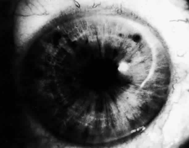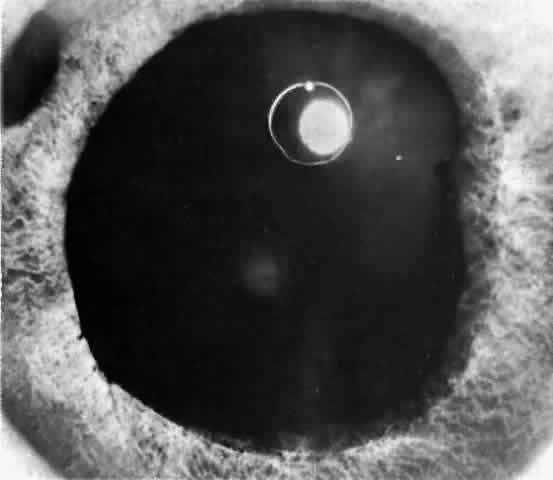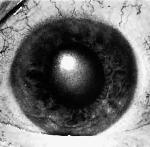 When a patient is seen after an attack that has been in progress for several hours or even days, the eye usually will display decreased vision. The pupil is irregular in shape, nonreactive to light, and resistant to the effects of miotics or mydriatics. It is a common misconception that the intraocular pressure remains elevated in angle-closure glaucoma. In some cases, low tension may be found after aqueous production has decreased while the angle remains closed. If the eye has recovered spontaneously from an attack, the intraocular pressure may be very low due to reduced aqueous formation with or without an open angle. It is important to realize that low pressure following elevated pressure due to acute angle-closure glaucoma does not necessarily mean that the angle-closure attack is over. The pressure will rise as soon as aqueous production resumes, which may be a few hours to many weeks later. The cornea may show Descemet's folds and later recover its transparency but occasionally the corneal edema may persist for weeks after reduction of intraocular pressure. A prolonged iris stromal edema encourages the formation of posterior synechiae in the pupillary area and peripheral anterior synechiae at the level of the angle structures. The destruction of iris tissue results in grayish patches of atrophic iris stroma that may extend to the periphery (Figs. 9 through 11). Tiny white-gray spots with discrete edges may be seen in the pupillary zone. These anterior subcapsular lenticular opacities, best known as glaukomflecken, appear to be the result of damage to the anterior lens epithelium from very high intraocular pressure (Fig. 12).35 Glaukomflecken may result from very high intraocular pressure of any etiology, but are especially characteristic of previous attacks of angle-closure glaucoma.