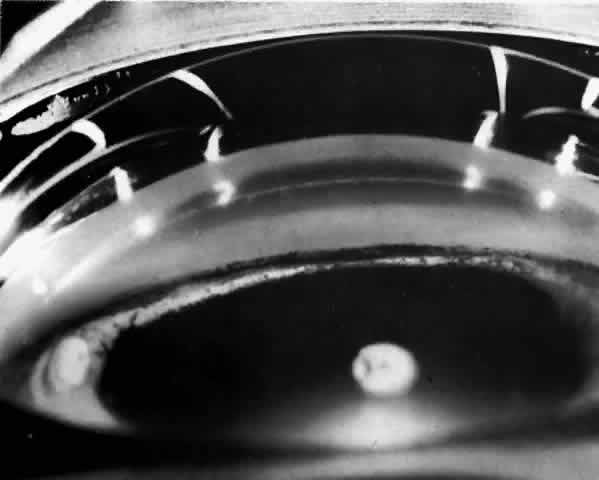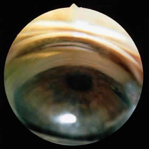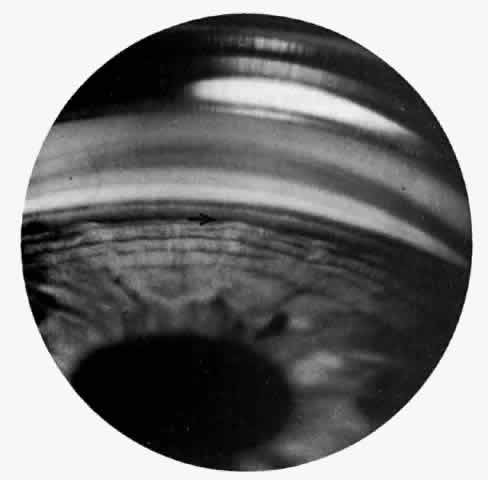 Signs On early examination, the cardinal sign of primary acute angle-closure glaucoma is present: a fixed mid-dilated pupil. There is profound reduction in central visual acuity. Photophobia and conjunctival hyperemia are striking external findings (Fig. 6). Intraocular pressure usually exceeds 40 mmHg and may be as high as 70 or 80 mmHg during the attack. On biomicroscopy, perilimbal hyperemia with a ciliary flush is accompanied by peripheral conjunctival and episcleral congestion. The peripheral iris bulges anteriorly and comes in close contact with the peripheral corneal endothelium for 360 degrees. Early microcystic epithelial corneal edema evolves to stromal edema. The anterior chamber appears shallow but formed centrally with cells, pigment and aqueous flare. Sustained high intraocular pressure affects the iris sphincter muscle, as well as its blood supply.33 Ischemia of sectors of the iris develop, probably due to compression of nutrient radial iris vessels causing infarction of the compromised iris and possibly also the ciliary body. This results in the release of debris and proteins, causing an aseptic anterior uveitis. If gonioscopy is obscured by corneal epithelial edema, application of topical 100% glycerol on the anesthetized cornea will often clear the edema sufficiently to permit adequate visualization of the peripheral anterior chamber and angle structures. During an attack, one sees only the cornea and iris meeting directly, with no evidence of the angle entrance or angle structures (Figs. 7 and 8). Indentation gonioscopy, introduced by Forbes,34 may be useful to differentiate between appositional and synechial closure of the angle. Central compression with a four mirror gonioscopy lens on the central cornea pushes the central aqueous to the peripheral anterior chamber. This maneuver pushes the peripheral iris posteriorly and opens an appositionally closed angle. If peripheral anterior synechiae are present, the angle will not be opened with indentation. The lower the initial pressure, the easier the examination. If the pressure is extremely high, indentation gonioscopy is extremely difficult, painful, and the cornea may be too edematous to allow visualization. If despite corneal dehydration with glycerol, edema of the affected eye precludes clear gonioscopy, examination of the angle structures of the fellow eye is often helpful. An extremely narrow closeable angle is usually present in the fellow eye giving strong evidence to the diagnosis of angle closure of the affected eye. Funduscopic examination is usually of little value because it is commonly precluded by corneal edema. When possible, early ophthalmoscopy shows pulsation of the retinal arterioles.