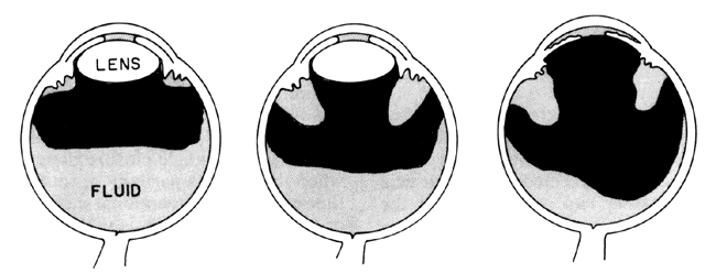 This large number of classification systems can generate confusion in communication between observers. By one grading system, a dangerously narrow angle may be described as grade IV. By another system, the same angle might be labeled grade I. The diversity of the grading systems requires both the retranslation from grade to anatomic interpretation and the identification of whose grade I or IV is being used. It seems that with frequent modern international communication of medical information, it is simpler and safer to use straightforward scientific English prose to describe angle anatomy. Chandler and Grant8 prefer to describe each angle verbally and to state whether it is judged closable or not. The Iris and Ciliary Body In some emmetropic and hyperopic, but rarely myopic eyes, the anterior chamber is shallow in structure with a narrow angle. This configuration can be related to heredity, a large lens, a structurally crowded anterior segment, or other anatomic characteristics. In some eyes, especially hyperopic eyes, the iris root inserts more anteriorly on the anteromedial surface of the ciliary body. The iris plane is typically convex. In addition, the ciliary body is more developed in hyperopic eyes, perhaps due to increased accommodative effort.27 These factors lead to increased narrowing of the angle recess. Another anatomic configuration, the so-called plateau iris configuration, may predispose to closure of the angle. This is a relatively rare anatomic configuration of the peripheral iris and was first described by Tornquist.28 In plateau iris configuration eyes, the anterior chamber appears to have normal axial depth and the iris plane remains flat. The chamber angle may be narrow, however, due to the location of the iris plane adjacent to anterior chamber structures. In the far periphery, the iris drops abruptly to a more posterior plane to create a very narrow recess over the filtration meshwork. In a somewhat different anatomic description, Barkan stated that the peripheral iris appears to be redundant with marked folds crowding the angle.29 This particular arrangement of the anterior iris plane gives the angle an appearance resembling a deep valley surrounding a flat-topped hill, thus the designation “plateau” (Fig. 5). Such eyes are susceptible to closure of the angle when the pupil dilates physiologically or pharmacologically. These anatomic factors may be said to predispose to closure of the angle but other factors, either physiologic or pharmacologic, must be superimposed to bring about actual closure of the angle. PHYSIOLOGIC FACTORS In an anatomically predisposed eye, several physiologic mechanisms can trigger angle-closure glaucoma. Of particular interest are the iris-lens interaction, pupil size, accommodation, and uveal vascular status. Relative Pupillary Block IRIS-LENS INTERACTION.Aqueous humor flows from the posterior chamber, between the posterior iris surface and anterior lens capsule, around the pupil edge and into the anterior chamber. In a normal eye, the iris is in contact with the lens only in the immediate vicinity of the pupillary margin. In eyes with shallow anterior chambers, the forward position of the lens brings the lens-iris diaphragm forward relative to the iris insertion plane. In addition, the anterior lens surface's greater curvature increases the area of apposition of the posterior iris surface to the lens. The increased surface apposition of the iris to lens causes an increased resistance to forward aqueous flow causing a pressure differential between the anterior and posterior chamber. The slightly greater pressure in the posterior chamber leads to forward bowing of the peripheral iris. This mechanism is known as relative pupillary block and it depends greatly on pupillary size and rigidity of the peripheral iris. Under normal circumstances, the iris tends to hang lax in the fluid medium and is sensitive to any pressure differential between the two chambers. Some degree of relative pupillary block is constantly present under normal circumstances, but eyes with a greater extent of lens-iris apposition have more relative pupillary block and are the ones most vulnerable to angle closure. PUPIL SIZE. One of the most important factors in closing the angle in an anatomically predisposed eye is dilation of the pupil. Dilation leading to closure of the angle may occur as a result of a variety of causes including darkness, emotion, and both topical and systemic dilating drugs. Iris-lens contact is maximal with pupil sizes between 3 and 4.5 mm, enhancing the relative pupillary block mechanism.30 In mid-dilation (3 to 4.5 mm), peripheral iris laxness combined with persistent relative pupillary block leads to closure of a narrow angle by the peripheral iris in predisposed eyes. Wide and rapid dilation minimizes the relative pupillary block phenomenon since iris-lenticular contact is reduced, and the aqueous passes forward through the widely dilated pupil easily. Dilation with sympathomimetic agents, alone or with cycloplegics, tends to decrease peripheral iris laxity by contracting the dilator fibers and thus decreases the likelihood of angle closure while the pupil is rapidly dilating. However, when the iris and ciliary body are slowly recovering from the drug effects and the pupil is gradually becoming smaller in size, the iris at mid-dilation reaches its worst relationship with the lens; relative pupillary block is maximal and the peripheral iris is lax. In this position of mid-dilation following wide dilation, an attack of acute angle closure commonly occurs. Topical anticholinergics are safe in the majority of eyes but they also increase the risk of angle closure in predisposed eyes. Cycloplegia results in a posterior displacement of the ciliary body, tightening of the zonules, flattening of the lens, and theoretical deepening of the anterior chamber. Mydriasis increases the lens-iris contact. When the pupil is in mid-dilation, the lens-iris c