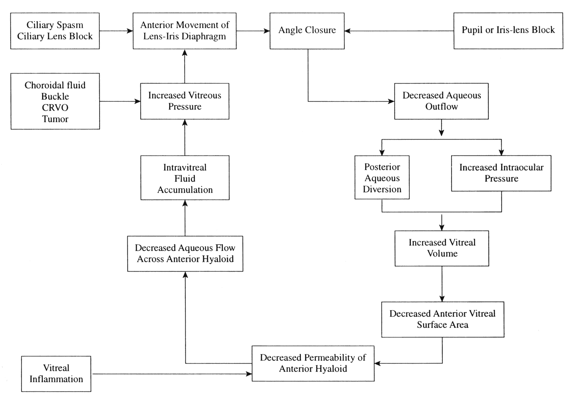 The fellow eye in malignant glaucoma is strongly predisposed to develop the condition. If the same clinical situation, such as closure of the angle, exists in the fellow eye at the time of surgery, one may expect a similar malignant course. In patients in whom the lens has been removed as therapy of malignant glaucoma, the condition may persist after cataract surgery. The features and behavior of the malignant glaucoma in aphakic and pseudophakic eyes are similar to those in phakic eyes. The level of intraocular pressure at the time of surgery in an attack of angle-closure glaucoma is a poor guide to the likelihood of the occurrence of malignant glaucoma because the tension may be normal or subnormal as a result of the effects of preoperative medication or of reduced aqueous formation, yet malignant glaucoma may follow. Malignant glaucoma is unlikely when the angle has been entirely opened with medical therapy before surgery for angle-closure glaucoma. However, when the angle is partially or totally closed at the time of laser or conventional surgery, the incidence of malignant glaucoma is increased. PATHOPHYSIOLOGY Observations concerning the relationship of the anterior vitreous, ciliary processes, and peripheral lens, and of the vitreous structure, as well as other information, has lead to acceptance of the hypothesis proposed by Shaffer.73 Shaffer proposed that malignant glaucoma is caused by posterior diversion of aqueous flow from the posterior chamber into the vitreous in place of the normal route from posterior to anterior chamber (Fig. 22). In malignant glaucoma, several anatomic observations have been made. Grant74 has carefully observed the relationship of the anterior vitreous, the ciliary processes, and the periphery of the lens. He noted that the tips of the ciliary processes may touch and overlap the equator of the lens when viewed through an iris coloboma. The ciliary processes are frequently pressed anteriorly and their tips are sometimes flattened by the periphery of the lens. In several patients, Grant observed the tips of some of the ciliary processes firmly adherent to the lens after an attack of malignant glaucoma had subsided. The space between the ciliary processes, however, can be seen to be open, and through the spaces one can see the vitreous behind. In phakic eyes with malignant glaucoma, the anterior vitreous face can sometimes be seen abnormally far forward behind the ciliary processes. In aphakic eyes, Grant has observed the vitreous face abnormally far forward in contact and adherent to the ciliary processes. Other interesting anatomic observations have been made with regard to the vitreous body in malignant glaucoma. In a few instances in which the eye was unusually clear, a smooth vitreous face was seen in the eye anterior to the middle of the vitreous cavity. This has been interpreted as a detached posterior hyaloid membrane. In some patients, this face was smooth and seemingly bowed forward and an optically clear space was present behind it, suggesting that fluid was trapped behind a detached vitreous body. Examination of the vitreous in certain eyes with malignant glaucoma has revealed optically clear areas within the vitreous cavity felt to be pockets of fluid. For both eyes of one patient, Tolentino made detailed vitreous drawings after Chandler and Simmons had successfully treated the patient medically several times for recurrent attacks of malignant glaucoma.75 These showed areas of fluid within the vitreous cavity that communicated with the posterior chamber of the eye. Epstein and colleagues76 further support Shaffer's hypothesis with perfusion studies in enucleated human and calf eyes. They found that increasing the pressure in the space posteriorly to the posterior hyaloid face in a posterior vitreous detachment decreased fluid movement through the vitreous gel. Further, they found that this resistance to flow could be further increased by decreasing the surface area of the anterior hyaloid membrane by apposing the peripheral anterior hyaloid to the peripheral lens and ciliary body. Fatt77 also found that increasing the pressure on the vitreous body caused decreased fluid conductivity through dehydration of the vitreous gel. This may explain Chandler's observation that lowering the intraocular pressure preoperatively in angle-closure glaucoma reduced the risk of developing malignant glaucoma. Quigley78 postulated the following sequence of events responsible for initiating malignant glaucoma: (1) posterior pressure is placed on the vitreous gel by fluid in the space posterior to the detached vitreous; (2) there is increased aqueous flow through the vitreous anteriorly, but some compaction or dehydration occurs; (3) this dehydration decreases fluid conductivity through the vitreous, further increasing the posterior pressure and decreasing fluid conductivity; and (4) the compacted vitreous gel is anteriorly displaced by the posterior-to-anterior pressure differential, which causes shallowing of the anterior chamber. This may explain why osmotic agents, which decrease the fluid in the vitreous cavity, are effective in malignant glaucoma. Therefore, many postulates point to an adverse cycle in which increased intraocular pressure with decreased aqueous outflow contributes to posterior diversion of aqueous. This leads to increased pressure in the vitreous and retrovitreal space and a subsequent decrease in vitreal permeability, forward movement of the vitreous, and increased apposition of the anterior hyaloid membrane to the lens and ciliary processes. This causes further decreased vitreous permeability, increasing vitreal expansion, and increasing posterior pressure, all of which leads to shallowing of the anterior chamber, further decreasing aqueous outflow and increasing intraocular pressure. Luntz and Rosenblatt79 have outlined this cycle in a flow chart (Fig. 23). It should be remembered that the these postulates are considered reasonable worki