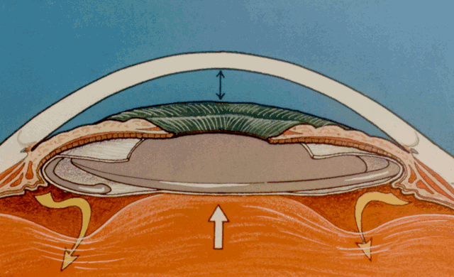 In months or years, in most cases, further shallowing of the anterior chamber will gradually occur despite the aforementioned laser therapies. Further intervention must then be entertained for imminent angle closure and rising intraocular pressure. Medical therapy can be employed to lower intraocular pressure. These include beta-blockers, alpha2 agonists, and topical or oral carbonic anhydrase inhibitors; however, medical therapy is usually only temporarily effective. Miotics and mydriatics are usually ineffective in altering the anterior chamber depth or altering the anterior chamber angle width. |