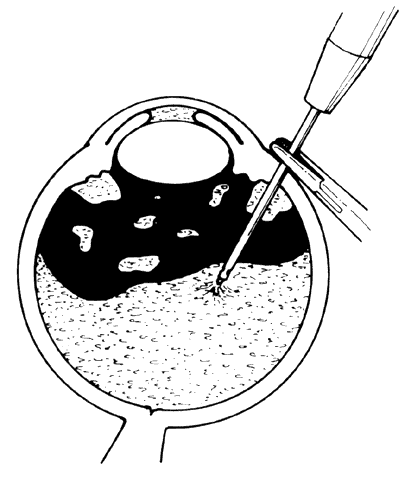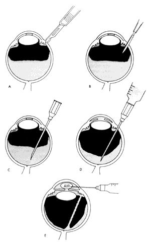CHANDLER'S VITREOUS OPERATION FOR MALIGNANT GLAUCOMA. Chandler's vitreous operation88,89 (Fig. 27) for malignant glaucoma was originally designed before automated vitreous suction cutters (AVSC) were available. The AVSC instrument is now preferred. First, however, the original non-AVSC technique will be described in a step-wise fashion. Original Nonautomated Technique A beveled incision is made in the peripheral cornea for the later injection into the anterior chamber. If one is not sure that a patent coloboma is present in the iris, a peripheral iridectomy is performed. A radial conjunctival-tenon's capsule incision is made 3 to 5 mm behind the external limbus in both lower quadrants, and a radial incision 4 mm in length is made in its base through the sclera into the suprachoroidal space in each lower quadrant. This incision is centered a measured distance of 3.5 mm behind the external limbus (Fig. 28A). The scleral incisions are opened to be sure that no fluid or blood is present in the supracilliary or suprachoroidal space. Because suprachoroidal fluid or blood can occasionally be present but not flow freely from a sclerotomy, a smooth spatula, such as a standard cyclodialysis spatula, should be carefully inserted into the lips of the sclerotomy and passed in circumferentially both clockwise and counterclockwise in the suprachoroidal space. The spatula must be pressed against the inner scleral surface to avoid damage to the underlying choroid. In the inferonasal quadrant, the scleral wound is left unsutured and the conjunctival-tenon's capsule opening is then closed with a single suture. At the lower temporal scleral wound, a ring of surface diathermy is placed around the scleral opening, using diathermy with sufficient power to produce brown discoloration of the sclera. This diathermy is used in an attempt to prevent later bleeding from the underlying uvea, and it also serves to widen the scleral opening slightly. A thin, sharp blade approximately 1 mm in width and 10 mm in length (similar to a Wheeler knife; see Fig. 28B) is then inserted into the vitreous cavity to a depth of approximately 10 mm through the pars plicata anterior to the vitreous base. The knife is aimed toward the optic nerve to avoid contact with the crystalline lens. The wound in the uvea is enlarged slightly anteriorly and posteriorly to a total length in a radial direction of 3 mm, with its center 3.5 mm behind the external limbus. A hemostat is then placed on an ordinary 18-gauge needle as a guard or hilt exactly 12 mm from the point of the needle. The 18-gauge needle (see Fig. 28C) is passed 12 mm into the vitreous cavity in the direction of the optic nerve. The hemostat serves as a guard on the needle to prevent its penetrating beyond the intended 12 mm and also serves as a handle to allow careful control of the needle. When the needle is fully inserted, the tip is moved from side to side a few millimeters in an attempt to open more widely the pathway of the needle through the vitreous body and through the hyaloid membranes. Fluid is allowed to escape from the needle and the wound spontaneously. Whether or not fluid escapes, a syringe is attached to the needle (see Fig. 28D) and 0.5 to 1.5 ml of fluid, or vitreous, or both is aspirated. Current Automated Technique With the advent of automated vitreous suction cutters, the original procedure described by Chandler was made safer. The vitrector is used instead of the needle to remove a central core of vitreous and possibly to aspirate any loculated collection of aqueous in the vitreous cavity (see Fig. 28). It is important to follow details of Chandler's effective original procedure, particularly the use of diathermy and the exact location of the entry into the globe, to avoid complications and retain efficacy. The anterior entry, 3.5 mm behind the limbus, recommended by Chandler allows disruption of the anterior hyaloid with the vitrectomy and greatly increases the reliability of the procedure. Standard pars plana vitrectomy with a more posterior incision into the vitreous body is less effective. Byrnes and co-workers97 reported on the use of pars plana vitrectomy in 21 patients with malignant glaucoma. They had an initial success rate of 70%. Eighty-three percent of the eyes that failed were phakic and they attributed these failures to the technical difficulties in perforating the anterior hyaloid face in phakic patients without damaging the lens. They again emphasized the importance of reestablishing anterior aqueous flow by disrupting the anterior hyaloid in addition to performing a vitrectomy. A small amount of saline is injected into the anterior chamber through the previously made paracentesis wound in the cornea to partially restore the shape of the semicollapsed eye, but the eye is not filled out completely to normal contour and tensions. One should avoid excessive saline injection into the anterior chamber because, in some eyes, saline will flow posteriorly. The saline will become trapped in or behind the vitreous body and the eye will then again become firm, with vitreous, iris, and lens pushed tightly into the anterior segment, as was the case before surgery. The anterior chamber is then filled with a very large air bubble that artificially deepens it and pushes the iris, lens (when present), and anterior vitreous posteriorly. (In Fig. 28E, the early stages of the air injection are represented; the injection is continued until the air bubble is much larger than is shown in the figure.) The anterior chamber is deepened to a depth that is both greater than that of a normal myopic eye and much greater than the original shallow depth of the anterior chamber of eyes predisposed to primary angle-closure glaucoma and malignant glaucoma. At the end of the procedure, the eye should be very soft. If the pressure is measurable at the end of the procedure, too much saline has been injected into the eye. It is tempting, with the advent of viscoelastic agents, to