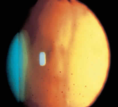 Chronic, mild anterior chamber cell and flare is common.124 Keratic precipitates are characteristically small, round, or stellate, with fine filaments between them (Fig. 6).121 Unlike other inflammatory conditions, they are distributed over the entire endothelium (Fig. 7).121 The anterior chamber angle is open. Inflammatory synechiae rarely develop spontaneously121 but may arise after cataract surgery.132 Neovascularization of the angle may occur (Fig. 8),22,123 but neovascular glaucoma is rare.133 Angle vessels are extremely fragile and have been reported to bleed with minor trauma such as gonioscopy,134 applanation tonometry,125 or Honan balloon application.135 Significant intraoperative hemorrhage is unusual,136 but minor bleeding may occur after a paracentesis, resulting in a discrete column of blood in the opposite angle (Amsler's sign).137 Ingeneral, angle abnormalities do not correlate well with the presence or severity of glaucoma.119