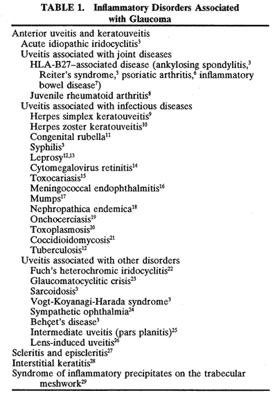 remains compromised.2 Inflamed eyes should be monitored closely to detect a late rise in IOP. In large reviews of uveitis patients, the reported prevalence of secondary glaucoma ranges from 9.6% to 23%.3–5 Although all types of ocular inflammation can lead to glaucoma, it is seen most frequently with iridocyclitis. In a study of 1254 consecutive patients at a uveitis clinic,3 glaucoma was seen most frequently with anterior, chronic, and granulomatous disease. Of those with glaucoma, 67% had anterior segment inflammation, 4% had intermediate uveitis, and 13% had posterior uveitis. The remaining patients had panuveitis. In this study, the types of uveitis that were most likely to result in glaucoma were secondary to herpes simplex and herpes zoster (22% developed glaucoma), Fuchs' heterochromic iridocyclitis, Vogt-Koyanagi-Harada syndrome, juvenile rheumatoid arthritis (JRA), syphilis, and sarcoidosis. Table 1 outlines the many types of uveitis reported to be associated with secondary glaucoma.