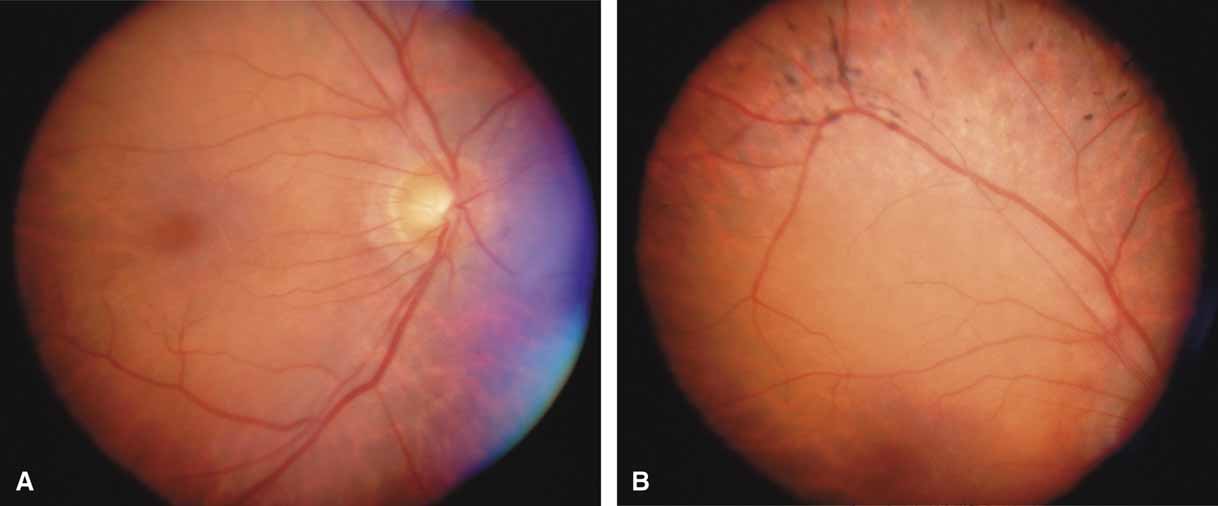 MULTIFACTORIAL LINKAGE Glaucoma occurs at a higher frequency in patients with certain retinal disorders than might be expected in an age-matched control group. The retinal disorder itself does not appear to have a direct role in the glaucoma, but the frequency of the association and the clinical relevance bear consideration. Retinal Detachments In the general population the incidence of primary open-angle glaucoma approaches 1%1; by comparison Becker reported 5.8% of patients with retinal detachments (31 of 530 patients) had unrecognized primary open-angle glaucoma in the contralateral eye, with the diagnosis based on disc analysis, visual fields, tonometry, and/or tonography.2 In a review of 817 patients undergoing primary retinal detachment repair, Phelps and Burton found glaucoma in 9.5% (78 of 817 patients); the glaucoma preceded the retinal detachment historically or by clinical evidence in 7.3% (60 of 817 patients) and followed the retinal detachment in 2.2% (18 of 817 patients).3 The reason for the association between retinal detachment and glaucoma was unclear and, surprisingly, the authors could find no definite risk factors in myopia, trauma, or the use of miotics. In aphakic eyes, however, the risk of glaucoma was three to four times more likely compared with the phakic group. Shammas and colleagues reviewed glaucoma risk factors in 30 patients with primary, atraumatic retinal detachments. Following the chronic administration of topical dexamethasone drops to the contralateral, nondetached eye, they found that 20% (6 of 30 patients) had an intraocular pressure rise of 16 mm Hg or higher.4 This was a significantly higher proportion than the expected 5% to 6% high-pressure corticosteroid responders reported previously in a general population group supporting a strong predisposition in patients with retinal detachment.5,6 A possible association between the use of miotics and acute retinal detachments has been suggested in numerous reports.7–9 These agents were of more clinical significance in the past, when they were a mainstay of glaucoma treatment, and the authors now limit their use to pseudophakic patients in which other agents have failed. Regardless, the association with retinal detachment should be kept in mind, particularly in susceptible patients (ex: high myopia). One study of patients with pigment dispersion syndrome (PDS) showed an increased prevalence of lattice changes and retinal detachment as compared to non-PDS patients having a similar distribution of myopic eyes.10 For this reason, a good peripheral examination in such patients is warranted, and recently symptomatic patients should be treated. This association may be genetically determined, either by a single gene or by two genes at closely linked loci. Unique anatomical variations at both the peripheral iris and vitreous base may explain this increased risk.10 Retinitis Pigmentosa The possible association between retinitis pigmentosa and glaucoma dates back to 1862.11 Over the past century the reported glaucoma incidence has varied between 2.98% to 10% of all cases of retinitis pigmentosa.12,13 Of concern in all previous reports is the accuracy of the diagnosis of retinitis pigmentosa itself, a hereditary disease with diverse manifestations. Retinitis pigmentosa-like syndromes may mimic glaucomatous field loss, and the pattern of advancement of visual field loss in true retinitis pigmentosa may parallel that of typical open-angle glaucoma. Patients with undiagnosed retinitis pigmentosa may have subtle fundus findings, especially those with the sine pigmento form (Fig. 1). A clue to diagnosis is the disproportionate peripheral field loss in comparison to the degree of optic nerve cupping and rim pallor. Patients with atypical field loss and minimal optic nerve cupping should have an electroretinogram to exclude unsuspected retinitis pigmentosa. Stickler's Syndrome Glaucoma has been reported in Stickler's vitreoretinopathy, an autosomal dominant disorder that demonstrates multiple systemic abnormalities in addition to the ocular abnormalities emphasized in seminal reports by Wagner14 and Janssen.15 Ophthalmic manifestations include an optically clear vitreous with prominent peripheral vitreoretinal membranes that have been associated with retinal detachment. High myopia, nuclear sclerotic cataracts, and glaucoma complete the eye findings. Systemic findings include flattened facies, high-arched palate, hearing loss, scapular abnormalities, and knee pain due to spondyloepiphyseal dysplasia. The glaucoma has been described as an open-angle type with both congenital and later-onset varieties. Phelps16 has reported normal angles on gonioscopy and a good response to medication. He recommended avoiding miotics in light of the peripheral retinal abnormalities, high myopia, and potentially higher risk of retinal detachment. Neovascular glaucoma has been reported, but occurs most often following multiple surgeries.17 OBSTRUCTIVE/PARTICULATE MATTER Particulate matter of varying sizes can cause a mechanical obstruction to outflow or in other ways damage the trabecular meshwork of an otherwise normal open-angle. The degree and duration of the pressure elevation, the underlying health of the optic nerve, and systemic factors determine the outcome and the ultimate effect on vision. Uveitis Disorders in this category affect the eye and adnexa in three general locations that frequently overlap: (1) anterior segment, (2) posterior segment, and (3) orbit (Table 2).18 Involvement of the anterior segment may produce a high, low, or normal intraocular pressure, depending on the balance between inflow and outflow.