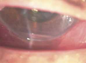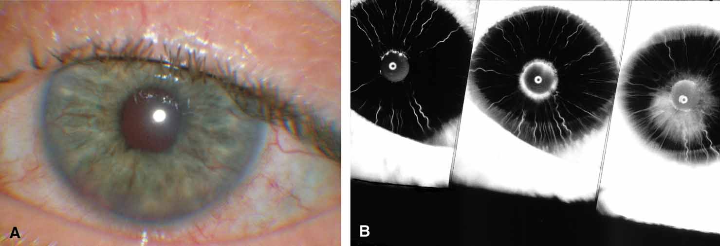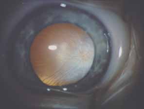 STRUCTURAL The designation “Structural” implies a mechanical crowding of anterior segment structures (lens, ciliary processes, and pars plana) that predisposes the eye to angle closure. Pupillary block may develop primarily from anatomical crowding, although angle closure secondary to ciliary body rotation may result from choroidal congestion. Whereas peripheral iridotomy/iridectomy is successful in pupillary block cases, proper treatment of the congestive component includes laser iridoplasty or angle deepening by cycloplegia or viscoelastic injection. Postvitrectomy Angle Closure One of us has recently treated two cases of pupillary block following pars plana vitrectomy with gas instillation for macular hole repair. In both cases, the gas fill was less than 30%, and the angle closure was successfully broken with laser iridotomies. In light of these findings, we presume that postoperative inflammation caused adhesions between the pupil and the crystalline lens with a subsequent angle closure. It is doubtful that the gas bubble contributed to the closure, although a pars plana tap is certainly warranted in cases of overfill. Post–pars plana vitrectomized eyes are at a higher risk for developing several different types of glaucomas, which can be identified by careful anterior segment and gonioscopic examinations.67 Persistent Fetal Vasculature (PFV) A congenital, unilateral (90%) malformation, persistent fetal vasculature (PFV) is recognizable at birth and is unrelated to prematurity.68 Originally called persistent hyperplastic primary vitreous (PHPV), Goldberg has proposed the newer terminology to reflect our better understanding of this clinical condition.69 In the classic description of this disorder (anterior form), one finds a microphthalmic eye with a shallow anterior chamber (Table 4); the posterior form is less frequently recognized, and glaucoma may occur in the involved eye in latter life.70 The anterior form, if untreated, may develop pupillary block glaucoma by vascular ingrowth of the tunica vasculosis lentis (Fig. 15) through the posterior capsule, leading to a sudden hydrostatic expansion of the lens. Milder forms of the condition have been recognized, and surgical removal of the lens is not always indicted.71 In most cases, pars plana lensectomy employing an anterior postlimbal entry has been advocated to avoid glaucoma and offer a chance for visual rehabilitation.71,72 Most late-onset cases of angle closure due to lenticular swelling occur in severely amblyopic eyes, and the intractable glaucoma in this setting is best treated by atropine, corticosteroids, Timoptic, and even enucleation, if required. In the anterior form of the disorder, the contralateral eye appears to be at risk for open-angle glaucoma later in adult life and should be observed closely.73