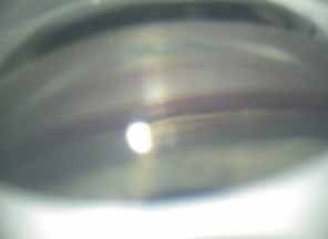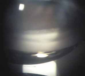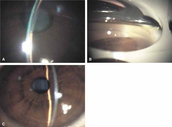 Melanomalytic glaucoma is the term applied to glaucoma due to macrophages laden with pigment released from necrosis of a ciliary body melanoma.31 However, because a similar picture may occur with a nonmalignant tumor (melanocytoma), the presence of glaucoma associated with a pigmented mass does not itself confirm the diagnosis of malignancy. Posterior segment metastases caused a pressure elevation due to angle closure–related choroidal mass effect or retinal detachment in only 1% of eyes.29 Leukemic involvement of the eye generally affects the choroid and retina, but iris infiltration, hypopyon, and glaucoma have been reported; irradiation is often successful in these cases.32 Schwartz Syndrome (Rod Outer Segment Obstruction) In 1973, Schwartz described 11 patients with a unilateral elevation of intraocular pressure, ranging from 29 to 55 mm Hg, who were found to have a rhegmatogenous retinal detachment that in some cases had been overlooked previously.33 Schwartz found the angles were open and normal except for one patient with an angle recession (5 of 11 patients had a history of trauma). The elevated pressures responded poorly to glaucoma medications given prior to the correct diagnosis, and successful retinal repair resulted in a normal intraocular pressure and outflow facility. More recent work34,35 suggests that trabecular obstruction by photoreceptor outer segments may play a role, although reduced aqueous outflow due to pigment dispersion and trabecular damage from previous trauma are all possible mechanisms of the glaucoma in this syndrome. This unique entity should be differentiated from coexistent primary open-angle glaucoma, which is usually bilateral, and from uveitic glaucoma, which generally responds to corticosteroids. It is important to exclude an occult retinal detachment in any medically unresponsive unilateral glaucoma especially prior to instituting miotics. Chronic miotic instillation may impair pupil size and compromise future retinal evaluation. Silicone Oil/Gas Over the past two decades silicone oil (dimethylpolysiloxane) has enjoyed a resurgence in the repair of complicated retinal detachments. In 1967, Watzke36 found no pressure elevation attributable to silicone but described droplets in the superior angle that result from silicone's lower specific gravity (buoyancy) compared with water. Silicone-induced glaucoma does occur, however, and one possible mechanism is an acute pupillary block due to the buoyancy of the silicone sometimes combined with overfilling the aphakic eye (Fig. 5). This can be averted by performing an inferior iridectomy and by paying careful attention to the silicone volume injected. A second mechanism involves chronic obstruction of an open angle by emulsified silicone microbubbles (more likely with low viscosity silicone, 1,000 centistokes, than high viscosity silicone, 12,500 centistokes) (Fig. 6), pigmented cells, and silicone-laden macrophages or silicone-induced fibrosis of the trabecular meshwork due to possible inherent fibrogenicity of this compound.37,38 Treatment of this open-angle glaucoma is generally medical, although silicone removal may be required. Although some studies have confirmed the presence of emulsified oil in the anterior chamber as a strong predictor of pressure elevation, others do not, suggesting that multiple factors are at play.39,40,41,42 Often this can only be seen on gonioscopy, and removal of the oil, if possible, is beneficial in some cases. Sometimes an expected pressure elevation that would otherwise occur may be muted by concomitant cyclitic membrane formation or hypotony associated with recurrent retinal detachment. The use of shunt procedures in this difficult glaucoma has led to the unusual complication of silicone oil escape into the subconjunctival space43,44 (Fig. 7). Whether placed superiorly or inferiorly, shunts should probably be avoided in these eyes unless the silicone oil can first be safely removed. Transscleral diode laser cyclophotocoagulation has been proven to be an excellent noninvasive option in treating these eyes for recalcitrant pressure elevation.45,46