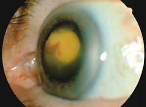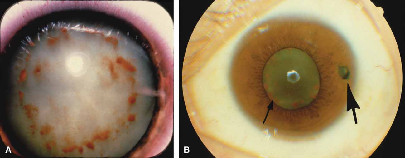 Specific posterior segment entities known to cause glaucoma include sarcoidosis, toxoplasmosis, and syphilis. In a study of 202 patients with sarcoid affecting the eyes, 10.9% (22 of 202) were found to have glaucoma at some time during the clinical course of the illness.19 Lichter20 reported that syphilis was associated with glaucoma of three distinct types: (1) iritic, which demonstrated peripheral anterior synechiae, a residua of inflammation; (2) narrow angle; and (3) irregular angle-closure, in which intraepithelial cysts of the ciliary body and iris are seen on gonioscopy and account for the variable narrowing of the angle approach. Active retinal involvement in acute toxoplasmosis may be associated with an acute elevation of intraocular pressure, sometimes producing corneal edema. When the cornea is cleared with topical glycerin, the angle is found to be open and a minimal anterior chamber reaction is present. The mechanism of the glaucoma is believed to be immune complex (antigen–antibody) deposition in the trabecular meshwork, rather than obstruction by cellular debris.21 The elevated pressure responds well to timolol or acetazolamide and does not require topical corticosteroids. Systemic treatment of the active retinitis should follow only if the optic nerve (positive Marcus Gunn), macular center, or peripapillary retina is involved. This unique entity will be missed if a fundus examination is not performed in all cases of hypertensive uveitis (Fig. 2). Active anterior or posterior uveitis, although minimally active, may upset the inflow/outflow balance severely and produce pressure elevations out of proportion to the anterior chamber reaction. Careful gonioscopy may reveal a localized trabeculitis manifesting as an occasional keratic precipitate on the trabecular meshwork or more anteriorly on the corneal endothelium. This easily overlooked syndrome mimics a medically unresponsive open-angle glaucoma and is important to correctly diagnose because the pressure can be lowered with the application of topical corticosteroids.22 In corticosteroid-sensitive persons, topical and periocular corticosteroid-related pressure elevations may become intractable. Long-acting depot preparations may require surgical removal of the depot corticosteroid to ameliorate the pressure elevation.23 Treatment with corticosteroids may hasten the recovery from hypotony in dramatic fashion, producing an acute pressure elevation as the blood aqueous barrier recovers and inflow overwhelms outflow. For this reason, careful titration of the corticosteroid dosage and simultaneous observation of the effect on intraocular pressure is advised. Red Blood Cells Long-standing vitreous hemorrhage can produce an acute glaucoma of an open-angle type. Originally, the term hemolytic glaucoma was employed to describe these events because pathologic studies showed macrophages containing hemoglobin in the anterior chamber.24 The situation was thought to be analogous to phacolytic glaucoma (hypermature liquefied lens protein engulfed by macrophages). Later, Campbell and co-workers25,26 demonstrated that the major mechanism was trabecular meshwork obstruction by ghost cells, rather than red blood cells, hemoglobin, or macrophages. Red blood cells in the vitreous release their hemoglobin within a few days and become the less pliable membranous container called a ghost cell. For simplicity, we consider the conditions hemolytic glaucoma and ghost cell glaucoma to be interchangeable. Two other disorders, hemosiderotic and siderotic glaucoma, add confusion to the terminology. These entities are separate glaucomatous disorders due to iron-induced damage of an open trabecular meshwork. The source of the iron may be blood (hemosiderotic) or an occult iron-containing foreign body (siderotic). The majority of cases of ghost cell glaucoma occur following vitrectomy for diabetic retinopathy, vitreous hemorrhage due to trauma, or vitreous hemorrhage following anterior segment surgery (i.e., cataract extraction or corneal transplant). Although studies suggest that a disruption of the anterior hyaloid face may be a necessary precedent, ghost cell glaucoma probably can occur with an intact hyaloid if a sufficient quantity of vitreous blood is present.27 The clinical presentation includes acute pressure elevation, corneal edema, and lack of keratic precipitates. Minute tan cells (ghost cells) may layer out, producing a pseudohypopyon or, if admixed with blood, a “candy-striped” hypopyon. (Fig. 3) Intraocular pressure elevations after diabetic vitrectomy raise concerns regarding concomitant neovascular glaucoma. However, neovascular glaucoma rarely develops in the immediate postvitrectomy period, unless some anterior segment neovascularization was present preoperatively. Late-onset pressure elevations (> 6 to 8 weeks out) in a postvitrectomized diabetic eye usually signal neovascular glaucoma.
