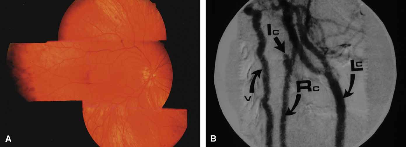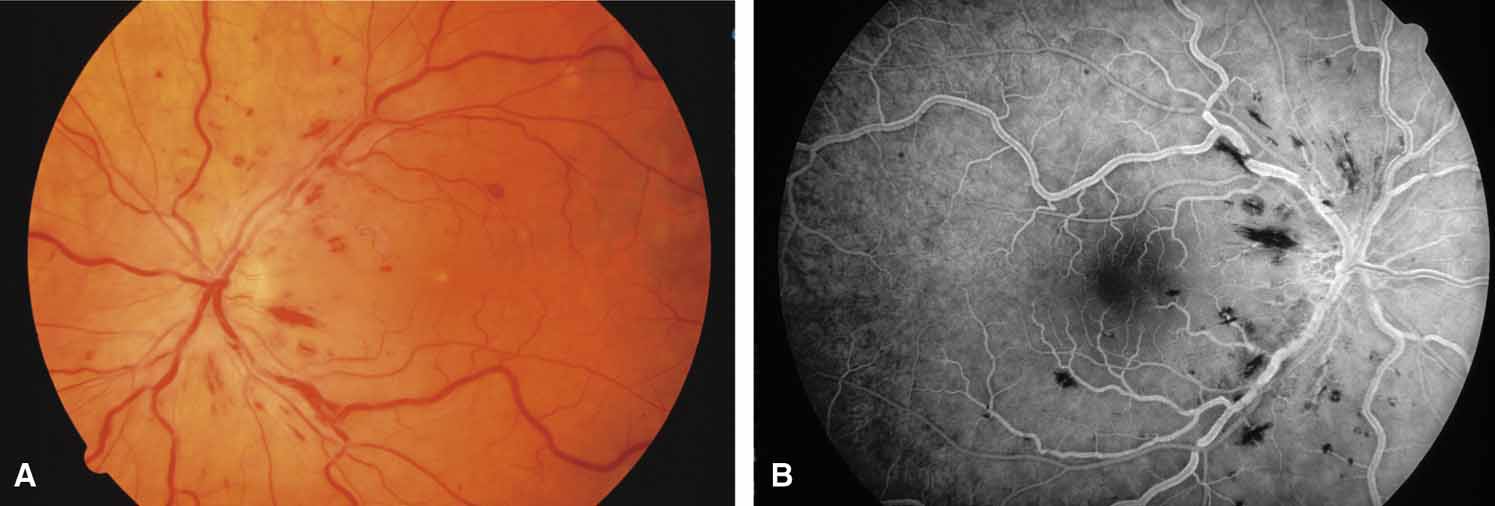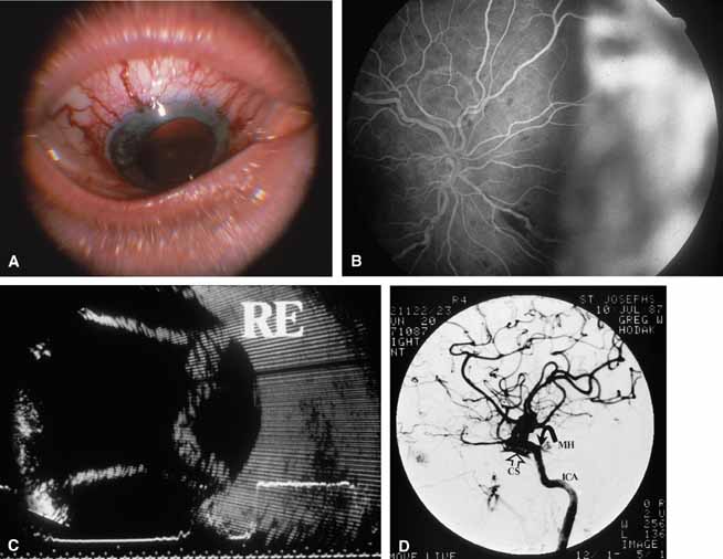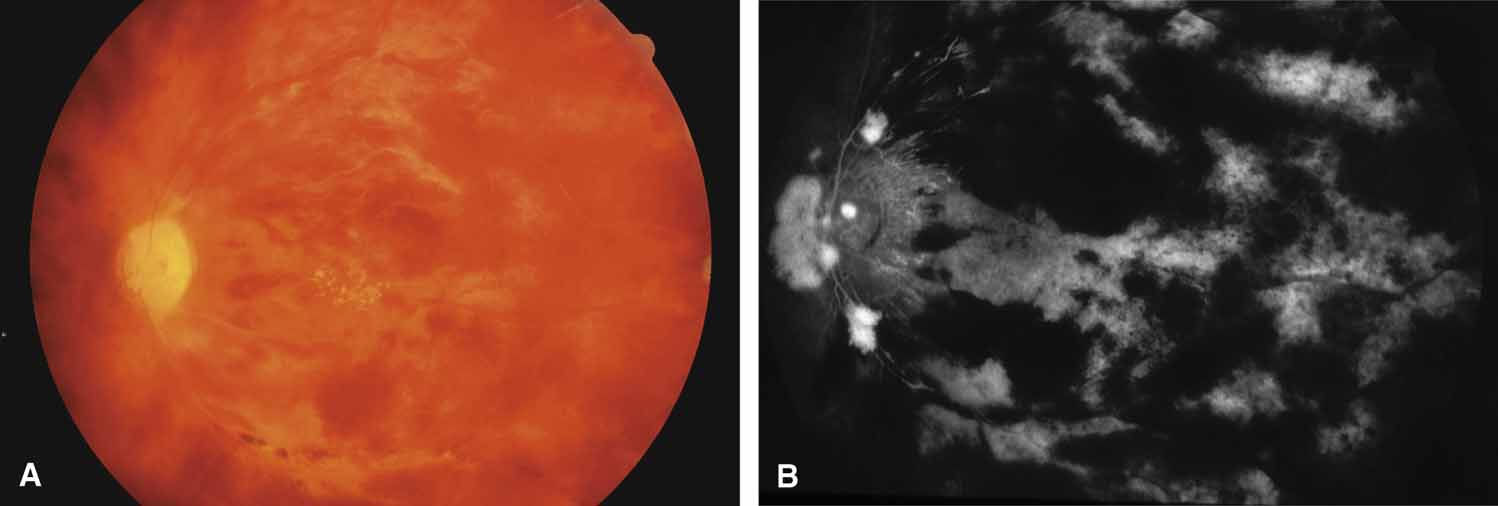Central Retinal Vein Occlusion (CRVO) The vascular thrombosis in central retinal vein occlusion is believed to lie within the optic nervehead at the level of the lamina cribrosa or behind where the vein and the artery share a common adventitial sheath.127 Rarely, an initial period of hypotony may develop after an acute central retinal vein occlusion.128 If major retinal capillary compromise is present,129 iris neovascularization may develop within 1 to 3 months and produce peripheral angle synechiae and angle closure. Ischemic central retinal vein occlusions represent less than one-third of all central venous obstructions and are characterized by multiple cotton-wool spots and a poor visual acuity, typically less than 20/200 (6/60) (Fig. 21). Rarely, an acute central retinal vein occlusion may produce choroidal congestion, ciliary body congestion, and rotation with transient peripheral iris angle narrowing and closure (Fig. 22) (see Table 6).123,124 This acute cyclocongestive glaucoma usually responds well to acetazolamide and cycloplegia. Although cotton-wool spots represent infarcts of the nerve fiber layer and may be a clinical sign of ischemia, any eye with a central retinal vein occlusion should be monitored with monthly slit lamp and gonioscopic exams. The onset of neovascularization of iris or angle warrants pan retinal photocoagulation to try to prevent neovascular glaucoma.130,131 Between 10% and 20% of eyes with central retinal vein occlusion may convert from an initial nonischemic angiographic picture to ischemia, especially if the initial vision is poor. The greatest risk of conversion to ischemia is found 1 to 3 months following the occlusion but can occur even later. Nonischemic occlusions (Fig. 23) should be followed closely during this time period. Although most practices now follow the clinical exam to evaluate of CRVOs instead of fluorescein angiography, significant nonperfusion on angiography still guides some clinicians toward prophylactic pan retinal photocoagulation. In the past, some utilized the electroretinogram (ERG) to define those eyes at greatest risk for neovascularization.132 The ERG was of particular value in those eyes, which confounded conventional angiographic evaluation due to a small pupil, cataract, or those that might have undetectable peripheral ischemia. Treatment by photocoagulation (possible with a large pupil and a clear lens) or peripheral retinal pancryoablation (in cases with a small pupil and/or cataract) may abort the neovascular stimulus and may induce regression in established iris neovascularization, producing a temporary or long-lasting drop in intraocular pressure. For established neovascular glaucoma, more vigorous methods of glaucoma control are required,133 including filtration surgery with antimetabolites134 or aqueous shunts.135,136 These methods should be considered in eyes with ambulatory vision. In eyes with hand motions or light perception vision, noninvasive transscleral diode laser cyclophotocoagulation or cyclocryotherapy may be considered, although this latter treatment may result in phthisis and rarely in sympathetic ophthalmia.137 Retrobulbar alcohol and Thorazine106 for pain control or enucleation107 are other options. In 20% to 30% of cases of central retinal vein occlusion, signs of primary open-angle glaucoma are present in the contralateral, uninvolved eye,138 which must be diligently examined. Diabetes Mellitus Many cases of iris neovascularization develop following ocular surgery, particularly following pars plana vitrectomy for posterior segment complications of proliferative diabetic retinopathy, especially if lensectomy is required (risk increased by twofold) or if preexisting iris neovascularization is present.139 Preoperative iris neovascularization in diabetic patients may regress with successful retinal reattachment by vitrectomy, whereas persistent, postoperative retinal detachment invariably results in neovascular glaucoma and blindness.140 Cataract surgery alone has been implicated as a risk factor for the development of rubeosis and neovascular glaucoma in diabetic patients with proliferative retinopathy (Fig. 24).141 Spontaneous iris neovascularization developing in the absence of posterior segment disease signs of diabetic retinopathy or venous occlusion should prompt an investigation for other entities that produce ischemia such as carotid artery stenosis, especially in patients older than age 50.142 An entity known as anterior hyaloidal fibrovascular proliferation describes the postvitrectomy proliferation of new vessels on the peripheral retina, pars plana, ciliary body, and sometimes the iris.143 This disorder has replaced neovascular glaucoma as the most frequent postsurgical complication of diabetic vitrectomy (Fig. 25).144 There is increasing recognition that the frequency of anterior hyaloidal fibrovascular proliferation may be related to vitreous traction at the sclerotomy sites or the severity of the diabetic retinopathy.145 Although iris neovascularization and glaucoma may result, the more severe clinical outcome is retinal detachment and hypotony secondary to ciliary body detachment by a cyclitic membrane. Anterior hyaloidal fibrovascular proliferation with retinal detachment or vitreous hemorrhage is treated by repeat vitrectomy combined with lens removal, vitreous base dissection, and endophotocoagulation. In diabetic eyes requiring complicated vitrectomies, usually with lensectomy, a unique syndrome of fibrin pupillary block glaucoma has been described.146 The fibrin is a result of surgical trauma and is especially frequent in eyes with preexisting iris neovascularization. The fibrin clot occludes the pupil, resulting in an acute aphakic pupillary block glaucoma. The treatment of this unique syndrome includes argon or Nd: YAG laser disruption of the pupillary membrane or fibrin clot dissolution by intracameral injection of tissue plasminogen activator.147 Carotid Artery Disease Feature