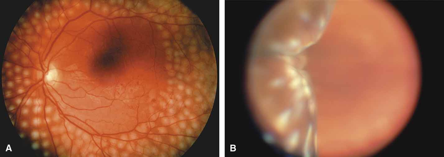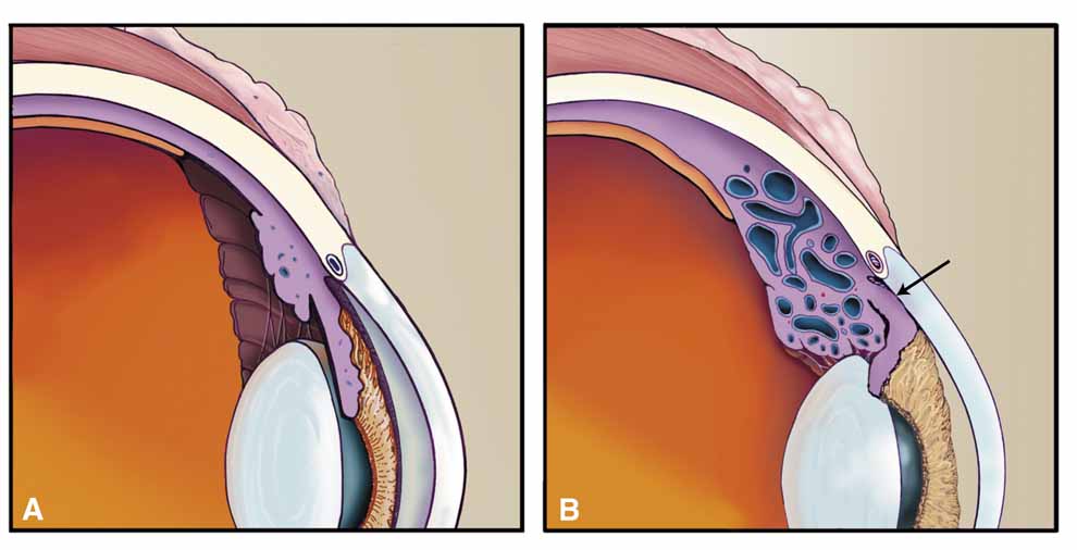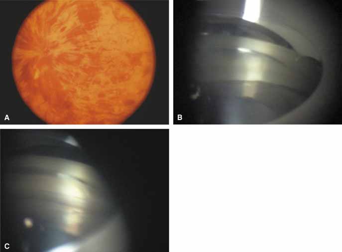 Retinal Dysplasia The term retinal dysplasia was originally used to describe a syndrome including abnormalities of the brain, heart, extremities, mouth, and eye. The current, preferred use of the term designates a pathologic retinal lesion involving dysplastic retina in a malformed eye and not a specific clinical syndrome.74 This term may describe the dysplastic retina seen in persistent hyperplastic primary vitreous, chromosomal trisomy syndrome 13–15, and the fetal effects of maternal ingestion of D-lysergic diethylamide (LSD). Secondary angle-closure glaucoma of the pupillary block variety may develop as a result of anterior chamber angle malformation. Retinopathy of Prematurity In cases involving a blind eye with an organized total retinal detachment judged inoperable, treatment options should include cycloplegics, corticosteroids, and possibly cyclodestructive therapy.75 Lens aspiration in infants to relieve an acute, secondary angle-closure glaucoma should be considered as a prelude to definitive vitrectomy for complicated retinal detachment (stage 4 or 5). Vitrectomy results in these patients are under evaluation and remain controversial. In later life, angle-closure glaucoma can occur in a seeing eye despite high myopia (stage 1).76 In those eyes with the cicatricial phase of the disease, crowding of the anterior ocular structures predisposes to a pupillary block glaucoma (Fig. 16; Table 5).77–80 Treatment of the acute angle closure would include laser (argon or neodynium: yttrium-aluminum-garnet [Nd: YAG]) or surgical iridectomy. The glaucoma mechanisms in these severely afflicted eyes may be multifactorial and include iris neovascularization.