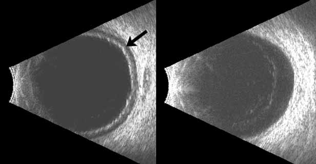 Postoperative Scleral Buckling Although postoperative pressure elevation following a routine scleral buckling is common, the incidence of clinically significant pressure elevations manifesting as pain and corneal edema is low.87 Choroidal congestion, which may be obvious or detectable only by ultrasonography, causes forward rotation of the ciliary body and closure of the peripheral angle. This situation is more likely to occur as a result of closure or compression of the vortex veins by broad scleral exoplants, which encourages postoperative choroidal edema.88 Exacerbating factors include excessive cryoretinopexy (choroidal congestion), drainage of subretinal fluid, and paracentesis during surgery.89 Treatment should include a trial of acetazolamide, atropine, corticosteroids, and aqueous suppressants. If no improvement is noted in 5 to 7 days, then peripheral laser iris retraction (laser iridoplasty = laser gonioplasty = iridoretraction) may thermally contract the iris, pull open the angle, and relieve the pressure elevation.90 If this fails, choroidal drainage combined with release of the scleral buckle will eliminate the mechanical obstruction of the vortex system.91 Postoperative Panretinal Photocoagulation Most of the mild, asymptomatic, and transient pressure elevations noted immediately after panretinal photocoagulation occur by unknown mechanisms in the presence of an open angle.92 Occasionally, heat-induced choroidal congestion, choroidal vascular permeability, and choroidal vascular obstruction may, as discussed previously, result in ciliary body rotation and closure of the peripheral angle (Fig. 18). Usually the narrow or closed angles resolve within several days, and thus far no severe visual complications have been reported. Choroidal congestion/effusion occurs frequently but is usually not clinically significant or recognized. Limiting the number of laser burns and the amount of retinal area treated can prevent this problem from occurring.93 Dividing panretinal photocoagulation treatments into two or more sessions several weeks apart is advisable when possible. Photocoagulative pressure elevations usually respond to cycloplegia, aqueous suppressants (acetazolamide and timolol), and osmotics.94 Metastatic Tumor to the Choroid Widespread metastases to the choroid usually present as multifocal, 2 to 4 disc diameter, grayish mounds that may have associated subretinal fluid. Massive choroidal tumor invasion may produce forward rotation of the ciliary body due to mass effect and vascular choroidal congestion, leading to an acute glaucoma with peripheral angle closure and a shallow but preserved anterior chamber.95 Although medical treatment (cycloplegics, corticosteroids, acetazolamide, and timolol) may produce respite from pain, enucleation of a nonseeing painful eye seems advised. Nanophthalmos Eyes with a cycloplegic refraction of greater than +7.50 diopters or axial diameter less than 20 mm by quantitative biometry are deemed nanophthalmic.96 These eyes may develop angle-closure glaucoma in the fourth to sixth decades of life (Fig. 19). A congenital thickening of the sclera results in obstruction of the vortex veins and secondary choroidal congestion, forward rotation of the ciliary body, and closure of the peripheral angle.97 Uveal effusion and exudative retinal detachment have been found to precede98 or follow ocular surgery and may be a factor leading to forward rotation of the ciliary body and iris lens diaphragm producing a cyclocongestive glaucoma. This severe glaucoma may respond to treatment with mannitol, atropine, and Neo-Synephrine. The failure of iridectomy to reliably relieve the condition suggests that relative pupillary block is not the primary event. Nonetheless, peripheral iridotomy should be tried, and if it is ineffective, then laser iridoplasty (peripheral laser iris retraction) may be attempted to physically “pull” the peripheral iris away from the angle.96,99 As in the other choroidal congestive glaucomas, pilocarpine is ineffective and should be avoided. The contralateral eye is also at risk, and management may also include laser iridoplasty for angles with severe narrowing.70 Vortex vein decompression, the Gass procedure (equatorial sclerectomy with sclerotomy),100 and/or unsutured operative sclerostomies should be considered for both acute ipsilateral glaucoma and if any ocular surgical procedures such as cataract extraction are performed.101 Prophylactic therapy in the other eye would include all these modalities, especially if choroidal effusion is present.96 A recent report describes a nanophthalmic patient who developed bilateral angle closure as a complication of systemic anticoagulation. This patient developed massive subretinal hemorrhage, which precipitated angle closure unresponsive to laser iridotomy and ultimately required vitreoretinal surgery.102 This report provides a good example of why nanophthalmic eyes, owing to their unique intraocular anatomy, must be closely monitored for unexpected responses to common clinical interventions. Acute Choroidal/Retinal Hemorrhage Approximately 5% of patients with age-related macular disciform scars may develop breakthrough hemorrhage into the vitreous cavity and further loss of peripheral vision. Patients taking aspirin or warfarin, those having a blood dyscrasia and those with systemic hypertension may be at a higher risk for such an occurrence. Acute angle closure glaucoma can occur with a hemorrhagic detachment of the retina, retinal pigment epithelium, and choroid that are so severe, sudden, and forceful as to cause the ciliary body to rotate forward. This occludes the peripheral drainage angle and produces an acutely painful eye with corneal edema and elevated pressure.103,104,105 Medical treatment with acetazolamide, corticosteroids, atropine, beta-blockers, and alpha agonists are sometimes useful in the short term to control the pressure elevation and relieve discomfort. When clot liquefic
