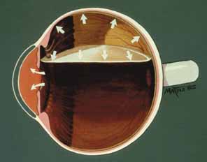 The goal of panretinal photocoagulation in advanced, acute stage 3 retinopathy of prematurity with plus disease is to induce the regression of neovascularization without traction.78 As more eyes are salvaged by this treatment method, it remains to be seen if these newly converted cicatricial stage eyes will assume a similar risk of acute pupillary block glaucoma. Iris Retraction Syndrome of Campbell The iris retraction syndrome of Campbell was described in eyes suffering from severe uveitis secondary to unattended retinal detachment.81 The uveitis produced posterior synechiae, an irregular pupil, and pupillary seclusion. Theoretically there is posterior diversion of aqueous from the ciliary body through the retinal hole and into the choroid, producing low pressure with a deep anterior chamber (iris retraction), owing to a reduced vitreous volume. These eyes may spontaneously improve their ciliary body fluid output or may respond to corticosteroid treatment, leading to a sudden, severe angle-closure glaucoma by a pupillary block mechanism with iris bombé. Peripheral iridotomy by laser (argon or Nd: YAG) or surgery may relieve the acute glaucoma, but the severe retinal detachment complicated by proliferative vitreoretinopathy and uveitis often results in a poor surgical outcome despite modern vitreoretinal techniques. CYCLOCONGESTIVE/CILIOCHOROIDAL EFFUSION SYNDROME All disorders in this group have some degree of choroidal congestion (Table 6), which may be noted by the usual clinical signs of clinical moundlike or annular choroidal detachment or be completely undetected, particularly if anteriorly placed and hidden behind the iris.82 Choroidal congestion can produce forward rotation of the ciliary body, resulting in closure of the peripheral angle and a shallow but preserved central anterior chamber (Fig. 17).83 Although this may appear a contradiction of terms because choroidal detachments are usually associated with hypotony, experimental detachments of the ciliary body do not themselves result in aqueous shutdown,84 suggesting that low pressure with choroidal effusion is due to hyposecretion secondary to concurrent iridocyclitis. Continued aqueous production in the presence of a closed peripheral angle results in an acute pressure elevation. Some clinical diseases sharing this mechanism have been mislabeled “malignant glaucoma,” an unfortunate name that adds mystique and confusion to the mechanism underlying these diseases. Though we prefer the term cyclocongestive to describe those disorders sharing this mechanism, other terms have been suggested including ciliochoroidal effusion syndrome.85 Either is descriptive of the pathophysiologic mechanisms that cause this clinical presentation. Miotics and peripheral iridectomy may worsen these conditions, whereas they are a first-line choice in the treatment of primary angle-closure glaucomas. Although cyclocongestive glaucoma may initially begin by ciliary body rotation with peripheral iris blocking the trabecular meshwork, if it is left untreated or diagnosed incorrectly, permanent, chronic angle closure may result, requiring goniosynechialysis or filtering surgery for adequate pressure control. Filtration surgery may actually precipitate the disorder in some cases.86