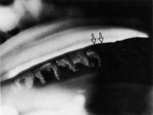 Plateau iris and cataracts are rarely discussed in the literature, perhaps because of the rarity of the plateau iris configuration. In contrast to the primary pupillary block glaucoma with angle closure, plateau iris is known to be associated with a deep central anterior chamber and an anterior iris insertion on the ciliary body. Acute attacks usually are precipitated by dilation of the pupil, and it is conceivable that if the pressure rises high enough and is of long duration, lens opacities such as glaukomflecken could occur. Peripheral iridectomy may be considered to relieve any small element of pupillary block, but in some cases the patient is still predisposed to develop angle closure and thus requires long-term miotic therapy. Therefore, cataracts can be caused by surgical trauma or flat anterior chambers if the iridectomy is performed surgically or because of the need for chronic miotic therapy. Another treatment option for plateau iris is argon laser peripheral iridoplasty, which flattens the peripheral iris by thinning it. In most cases, this procedure lasts for many years, although in some instances a gradual reclosure of the angle requires repeat iridoplasty.44 |