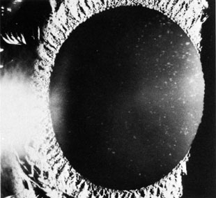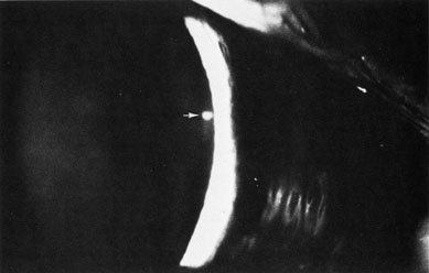 by acute angle-closure episodes. If the cataract is of such a nature to decrease vision significantly, the treatment is cataract removal and iridectomy. It is well known that treatment with parasympathomimetic agents, such as pilocarpine, has been implicated in the formation of lens opacities,40 although this may be related to older studies of its previous long-term use in open-angle glaucoma rather than short-term use in angle-closure glaucoma. Miotic therapy is discussed in further detail later in this chapter. A peripheral iridectomy is the treatment of choice for pupillary block glaucoma. Most iridectomies today are performed by laser, although surgical iridectomies are still performed in many parts of the world. The incidence of lens opacities after surgical peripheral iridectomy is increased, usually related to direct injury from a surgical instrument. Meticulous care at the time of surgery may decrease the incidence of direct traumatic cataracts.38 Prolonged flat anterior chambers occurring after peripheral iridectomy also may lead to a higher incidence of cataracts. Although the advent of laser iridotomy has greatly decreased the incidence of cataract development compared to surgical iridotomy, laser iridotomy (Fig. 4) also can cause lenticular changes. Several reports have demonstrated small lens opacities appearing at the site of the laser beam after laser iridotomy (Fig. 5),36,41,42 but no progression of these opacities has been described. Zonular rupture can occur from the laser as well.43 One case report describes an “exploding” cataract with posterior capsular rupture and release of cortical material into the vitreous following a YAG laser peripheral iridectomy.37