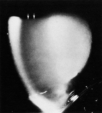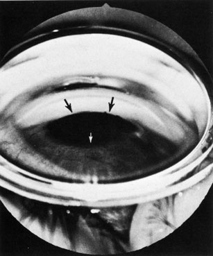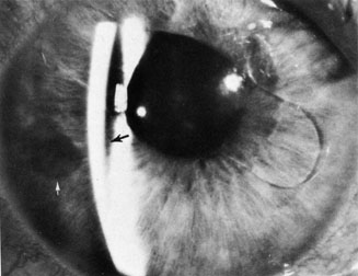 Pupillary block occurs quite frequently after the placement of an anterior chamber intraocular lens subsequent to cataract surgery (Fig. 10). Thus it is generally recommended to create a peripheral iridectomy at the time of surgery when placing an anterior chamber intraocular lens. Although rare, pupillary block glaucoma also can occur after posterior chamber intraocular lens implantation, even years after the original surgery.68