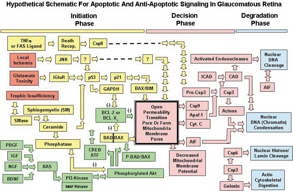 well as the intracellular signal cascade involved in the neurodegeneration. Apoptotic pathways involve complex multiply linked signaling steps that can be subdivided into three phases: initiation, decision, and degradation. Figure 1 is a schematic representation of these phases that depicts some of the known signal pathways and proteins, identified mostly from studies on cultured neurons, and it includes both pro-apoptotic and anti-apoptotic pathways. Studies on cell culture systems have also established the proof-of-principle that blocking one or more steps in pro-apoptotic signaling can delay the demise of a cell if not prevent it. It is evident that the earlier the pro-apoptotic signal cascade is interrupted the greater the likelihood will be of reversing it and thus preventing cell death. At present, most agents studied in model systems to establish proof-of-principle have been targeted to the post-mitochondrial degradation signals. These include drugs that are caspase inhibitors, inhibitors of caspase-activated DNAses, and inhibitors of endonucleases (Fig. 1). These agents have been shown to delay neural cell death in model systems, but there is some question whether blocking components mediating the late decisional and degradative phases may not be too late a step for a clinically useful drug to prevent, as opposed to delay, the death of that cell. However, on the basis of the emerging role of activated caspases generating toxic peptides from normal neuronal proteins such as amyloid precursor protein (APP), blockade of caspases and other proteases associated with apoptosis could be an important way to prevent signals from dying RGC causing secondary RGC death (see later discussion on APP). Mitochondria are most often viewed for their primary metabolic role of oxidative phosphorylation, but they also contribute to the control of intracellular Ca2+ levels and generate superoxide, both of which can influence the survival of neurons. However, their role in apoptosis signaling is emerging as a major target area for neuroprotection. There is an increasing body of evidence that mitochondria play a key decisional role in apoptosis initiated by the insults of ischemia, excitotoxins, and trophic insufficiency (shown in red) thought to be responsible for RGC death in glaucoma.58 The scheme in Figure 1 illustrates a pro-apoptotic pathway for trophic insufficiency (shown in yellow), acting through the enzyme sphingomyelinase, ceramide, and a phosphatase, which interrupts the anti-apoptotic signal pathway for BDNF and other trophic/growth factors (shown in green) by preventing activation of Akt, a key step in the neurotrophin anti-apoptotic signal pathway. The active (phosphorylated) form of Akt, which is itself a kinase, converts a pro-apoptotic protein such as BAD or BAX into phosphorylated form (P-BAD/BAX), thus inactivating it. Also shown is a pathway for local ischemia and overactivation of glutamate receptors (ionotropic glutamate receptor [iGluR]) acting through p53 and pro-apoptotic protein BAX, or related proteins such as BIM. These pathways also affect the anti-apoptotic interaction of BCL-2–like proteins that have specific binding sites on mitochondria. (Not shown is a more direct alternative pathway for iGluR overactivation and ischemia, which by induced cell depolarization, elevation of intracellular Ca2+ levels, and metabolic stress may directly cause mitochondrial depolarization and activate mitochondrial apoptotic signaling.) Thus, the major noxious initiating stimuli thought to be relevant to glaucoma (shown in red) seem to converge on the mitochondrion. APOPTOSIS SIGNALING BY MITOCHONDRIA The mitochondrion is a double-membrane organelle with the components for oxidative phosphorylation (e.g., the electron transport chain, cytochrome C, adenosine triphosphate (ATP) synthase, and adenine nucleotide transporter) located within or associated with the inner membrane. Energy derived from the electron transport chain pumps protons and other ions from the mitochondrial matrix across the inner membrane, maintaining a pH gradient and an electrochemical potential difference, termed the mitochondrial potential (MP). The recent development of potentiometric dyes that accumulate in and provide a measure of MP has shown that metabolic stress as well as noxious stimuli, such as trophic withdrawal, causes a decrease in MP that precedes apoptotic degeneration of a cell. The decrease in MP under metabolic stress, which depletes ATP, is caused in part by closure of ATP-activated K+ channels. As important as metabolism to maintain MP is the regulation of MP by a large complex of proteins that associate together at contact points of the mitochondrial inner and outer membranes, termed the mitochondrial permeability transition pore complex (PTPC). The PTPC normally functions as a regulated pore that can effect highly selective transfer of small molecules, including small proteins, between the matrix (the mitochondrial intermembrane space) and the host cell's cytoplasm. However, a sustained abnormal nonselective high-conductance opening of the pore results in dissipation of MP and is a critical event in the release of pro-apoptotic degradative signaling proteins. In the rat chronic elevated IOP glaucoma model, a significant downward shift in the distribution of MP level in RGC mitochondria was found compared with the retina of the contralateral normotensive eye.59 This preliminary result indicates that conclusions about the major role of mitochondria in apoptotic cell death obtained with cultured neurons may apply to apoptosis of RGCs in glaucoma. The release of signaling molecules from the mitochondria (pink, Fig. 1) includes cytochrome C and other caspase activators (Apaf-1), procaspase 9, and activators of the endonucleases that degrade DNA (apoptosis inducing factor [AIF]). Several ligands have been found that maintain regulation of the PTPC in the molecule-selective and low-conductive or closed 