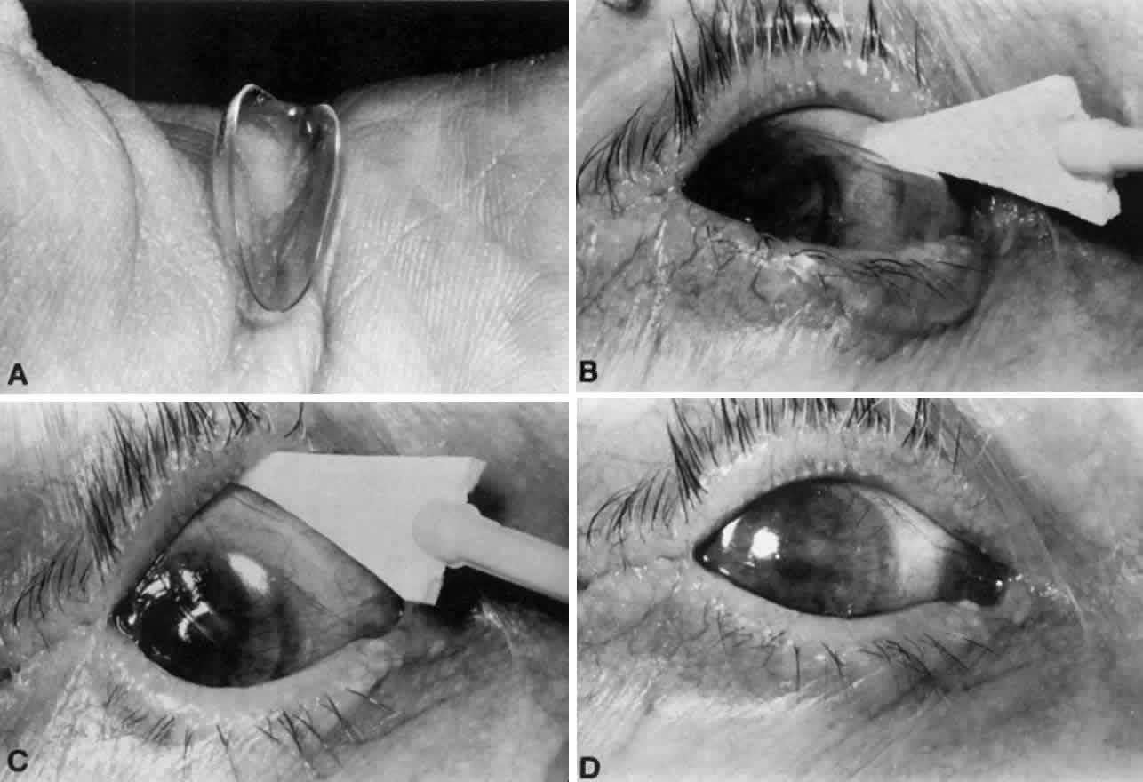 on clinician resources. Although prolonged therapeutic lens use occurs infrequently, instruction in lens removal and new lens insertion can be given, decreasing the number of office visits required. It is advantageous for either the patient or a family member to be capable of removing the therapeutic lens when pain or increased inflammation occurs. In this regard, it is a frequent problem for the family member, in the setting of increased symptoms, to be unable to accurately report to the clinician whether or not the contact lens is present, dislocated, or lost from the eye. Providing the patient and family with fluorescein drops greatly facilitates visualization of the therapeutic lens and accurate reporting to the clinician. |