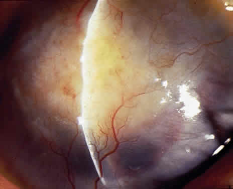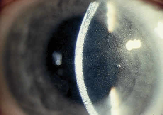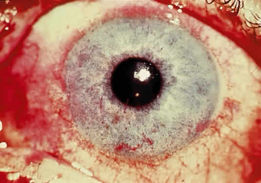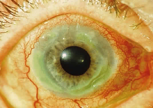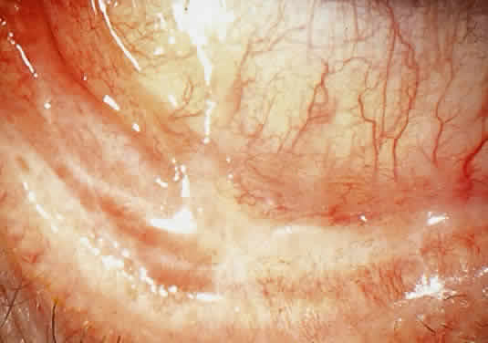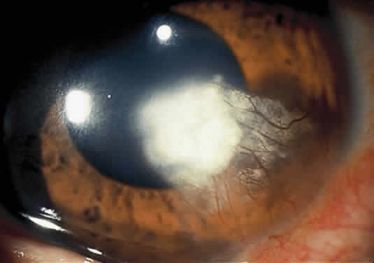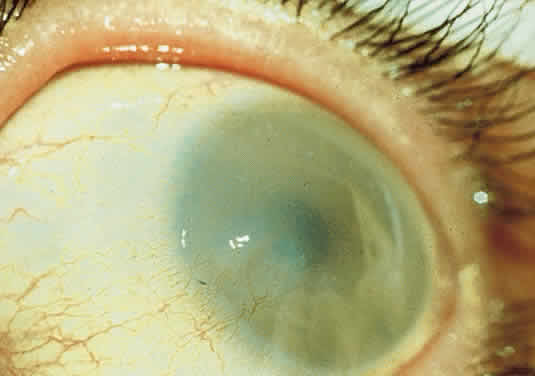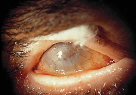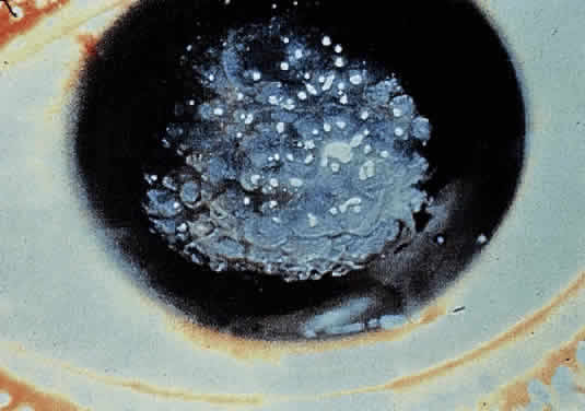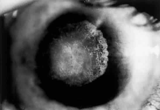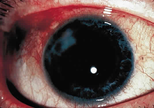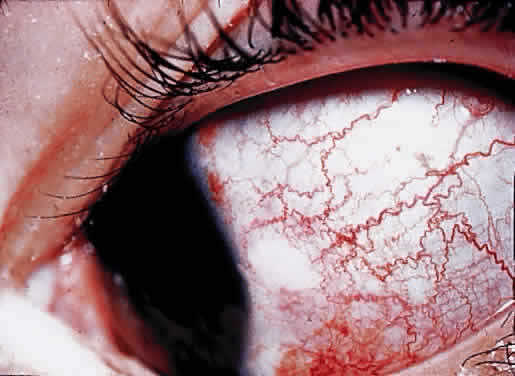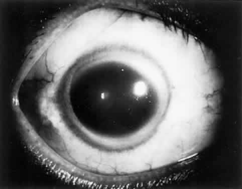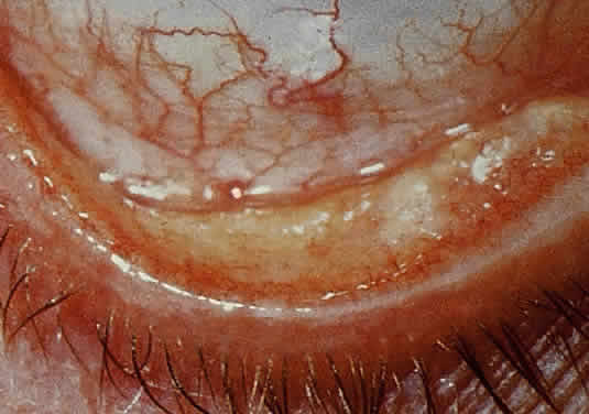 Patients complain of nonspecific symptoms, such as gritty sensation, tearing, and redness. The corneal involvement in acne rosacea can lead to blindness. Superficial punctate keratitis is the most common manifestation, followed by marginal vascular infiltration of the lower two thirds of the cornea; this pannus may progress around the entire corneal circumference. Vascularized, subepithelial infiltrates also may occur. In severe cases, corneal scarring and vascularization may result in corneal leukoma. Keratitis sicca is frequently associated with ocular rosacea (in 25% of cases in a recent study) 263 and may be secondary to decreased tear production,263 meibomian gland dysfunction, or both.264 The use of oral tetracycline has dramatically improved the prognosis in patients with this disease. Attention to lid hygiene, massage to unplug stagnant meibomian ducts, and the use of antibiotic ointments to diminish bacterial overgrowth are also important. Atopic Dermatitis Patients with atopic disease frequently have a history of eczema in early life and exhibit skin changes, especially in the flexor surfaces of the extremities. The lids may be thickened and exhibit scaling of the margins and surrounding skin. Conjunctival hyperemia, scarring, and fornix shrinkage may occur, especially inferiorly. The corneal changes include punctate epithelial keratitis, pannus, ulceration, and scarring. Cellular immunity is diminished in these patients, who are prone to superinfection with Staphylococcus aureus and herpes simplex (Fig. 35). Cataracts, retinal detachment, and keratoconus are also associated complications.265 Topical antihistamines and vasoconstrictors may be beneficial in mild cases; disodium cromoglycate 4% also may be used 4 times a day. In resistant cases, topical steroids bring dramatic relief of symptoms. Long-term steroid therapy is contraindicated in these patients, who are already predisposed to infection because of depressed cellular immunity.