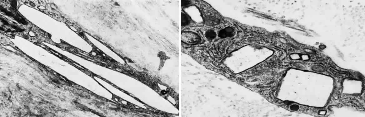 The characteristic clinical features of these disorders, including skeletal abnormalities, gargoyle facies, hepatosplenomegaly, cardiac disease, mental deficiency, deafness, and ocular involvement, occur with varying degrees of severity and overlap. The tissue-specific differences in the structure of mucopolysaccharides and the predominant types accumulated in various organs account for the variability in clinical manifestations. Ocular manifestations include progressive corneal clouding, optic atrophy, and retinal pigmentary degeneration. In these disorders, excess dermatan, chondroitin, and keratan sulfates accumulate in the cornea and in other body tissues, causing visceral manifestations, and heparan sulfate accumulates in the retina and in the central nervous system, causing mental deficiency. The accumulation of these abnormal substances results from the faulty catabolism of mucopolysaccharides in the lysosomes caused by deficiencies of lysosomal acid hydrolases (Figs. 18 and 19). In the cornea, this causes characteristic pathologic changes consisting of intracytoplasmic vacuolization of epithelium, subepithelial histiocytes, stromal keratocytes, and endothelium. In the conjunctiva, membrane-bound vacuoles found in the cytoplasm represent fine granular material in lysosomes. Large storage vacuoles form in histiocytes, which are called gargoyle cells. Night blindness associated with retinal pigmentary degeneration and bone-spicule appearance is seen only in MPS types that involve storage of heparan sulfate. Papilledema, a frequent finding, has been attributed to the hydrocephalus that occurs secondary to meningeal thickening with the storage material; narrowing of the scleral canal of the nerve head, as a result of posterior scleral thickening with mucopolysaccharide accumulation, may play a role in the optic nerve head swelling. Acute and chronic glaucoma may be seen in MPS I-H, I-S, and I H-S. Conjunctival biopsy is an important diagnostic step in these disorders, owing primarily to its popularization by Kenyon and colleagues173 and by others.174 This simple procedure has become increasingly applicable as a reliable screening test for patients with suspected lysosomal diseases. A small fragment from the upper bulbar conjunctiva is easily removed, using topical anesthetic without sedation, and sent for ultrastructural evaluation (Fig. 20). The diagnosis of mucopolysaccharidosis is based primarily on the characteristic clinical findings; specific enzymatic assays can be performed for definitive diagnosis and further categorization of the different types and subtypes. MPS 1-H (Hurler's Syndrome) This autosomal-recessive syndrome, which becomes manifest in infancy, is one of the most severe mucopolysaccharidoses. The basic genetic defect is the absence of the lysosomal enzyme α-L-iduronidase, which renders the cells incapable of cleaving iduronic acid residue in polysaccharide chains. As a result of the enzyme defect, both heparan sulfate and dermatan sulfate are excreted in the urine.175 The infant may develop normally for a few months before mental and physical deterioration begins.176 The clinical features include dwarfism, grotesque facies, hepatomegaly, progressive mental retardation, skeletal abnormalities, hirsutism, and cardiovascular disease. Progressive corneal clouding occurs in all patients and may conceal the retinal degeneration that develops concurrently. The usual cause of death, which occurs before 10 years of age, is respiratory infection and cardiac failure. The change in body tissue is caused by an accumulation of mucopolysaccharides (Fig. 21).