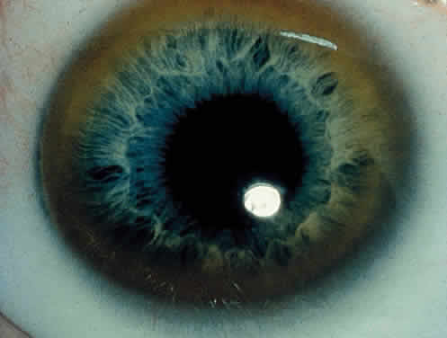 Corneal deposits appear as a layer of homogeneously distributed, fusiform or needle-shaped, iridescent crystals situated in the stroma beneath the epithelium. In the infantile form, anterior crystal deposition begins early in life (between 6 and 15 months of age) and proceeds posteriorly as the patient ages; deposition advances more rapidly in the periphery. The anterior location of the crystals may be associated with recurrent erosions.33 The depth of the stromal deposition and the density of crystals is always greater peripherally than centrally. More and larger crystals occur in the superficial stroma. No visual impairment occurs at this early stage. By the age of 7 years, most patients have crystals, either within or on the endothelial surface34,35; markedly decreased corneal sensitivity is also present.36 The spherical contrast sensitivity function is significantly lower in infantile cystinosis than in age-matched controls.37 The conjunctiva has a ground-glass appearance. Polychromatic, polymorphic, rectangular, or rhomboidal crystals can be seen with the biomicroscope. The uvea contains an abundance of polymorphous crystals. Clinically, these can be seen as glistening dots on the surface of the iris. Thickened iris stroma and posterior synechiae may occur; pupillary block glaucoma38 also has been reported. The entire uvea has polymorphic crystal deposition, most heavily in the choroid. The sclera also has crystal deposition. The retinal abnormality consists of a generalized depigmentation that may assume a patchy pattern. At first the pigmentary disturbance tends to be peripheral, but it progresses with age. Macular abnormalities have been observed.39 Intracellular crystals also have been seen in the retinal pigment epithelial cells during electron microscopy. DIAGNOSIS. The ocular findings of cystinosis are sufficiently unique and characteristic to form the basis for a diagnosis of this disease. A specific diagnosis of cystinosis can be made by assaying for cystine in biopsied conjunctiva.40 Conjunctival biopsy is a simple and benign technique that may provide the diagnosis for this and other inborn errors of metabolism. DIFFERENTIAL DIAGNOSES. Polychromatic corneal crystals similar to those in cystinosis also may be seen in multiple myeloma,41 Schnyder's crystalline dystrophy, Bietti's crystalline dystrophy, gout, and chrysiasis. MANAGEMENT. The results of therapy with penicillamine and a cystine-free diet for infantile nephropathy have been disappointing.29 Oral cysteamine is the only available treatment for the nephropathy of infantile cystinosis. The cystine depletion that occurs through the formation of cystine-cysteamine-mixed disulfide42,43 apparently helps stabilize glomerular function and also improves growth and development.44 Cysteamine treatment decreases the deposition of additional cystine in the kidneys; but it does not reverse existing renal tubular and glomerular damage or gradual loss of kidney function.45 There is no evidence that corneal cystine deposition, posterior synechiae, or rod and cone dysfunction are reversible with cysteamine treatment; it may only prevent further ocular damage. Renal transplantation is an alternative therapy for patients with advanced renal disease. As a result of renal transplantation, children are now surviving to the second and third decades with normal renal function. Although cystine is not deposited in a grafted kidney, it appears to accumulate relentlessly in other organs and tissues, especially ocular tissue, and progressive visual impairment has been documented.46 Continued therapy with oral cysteamine after renal transplantation currently must be considered. Reversal of corneal crystal deposition by topically administered cysteamine has been reported.47,48 Although penetrating keratoplasty can be performed for advanced corneal cystinosis with endothelial decompensation, cystinosis can recur in the transplanted graft.33 Wilson's Disease (Hepatolenticular Degeneration) and Hypercupremia Wilson's disease is an autosomal-recessive inborn error of metabolism in which excess copper deposition occurs, primarily in the liver (leading to cirrhosis), the kidneys (leading to renal tubular damage), the brain (leading to widespread failure of motor function while sparing sensory function), and Descemet's membrane of the cornea.49 The ATP7B gene on chromosome 13 that is mutated in this disease has been cloned and sequenced, and the resulting protein product is a copper-transporting ATPase. Because more than forty mutant forms of this gene have been identified, molecular diagnosis is only practical in family members of patients in whom the genetic defect has already been identified.50 Clinical manifestations rarely occur before 6 years of age and may be delayed until the fifth decade. Approximately 40% of patients present with symptoms of hepatic disease, and 40% develop symptoms referable to the nervous system.51 This copper storage disease is probably caused by an intrahepatic defect in copper metabolism that leads to impaired excretion of the metal in the bowel and, concurrently, to decreased ceruloplasmin (α2-globulin) synthesis. The result of this defect is that, for the first few years of life, increasing amounts of copper are stored in the liver. At some point, necrosis of the liver cells occurs, and the copper is released into the blood and deposited in other tissues.52 OCULAR FINDINGS. One of the few truly diagnostic and pathognomonic physical signs in clinical medicine is a Kayser-Fleischer corneal pigment ring found in patients with Wilson's disease (Fig. 5).This ring is recognized as a golden-brown, ruby-red, or green band of 1.0 to 3.0 mm, starting at the limbus but at the level of Descemet's membrane.53 The color of the ring is presumably caused by scattering and reflection of incident light and by photointerference effects created by the layers of copper granules. Such variables as size, shape, and unit density of the gran